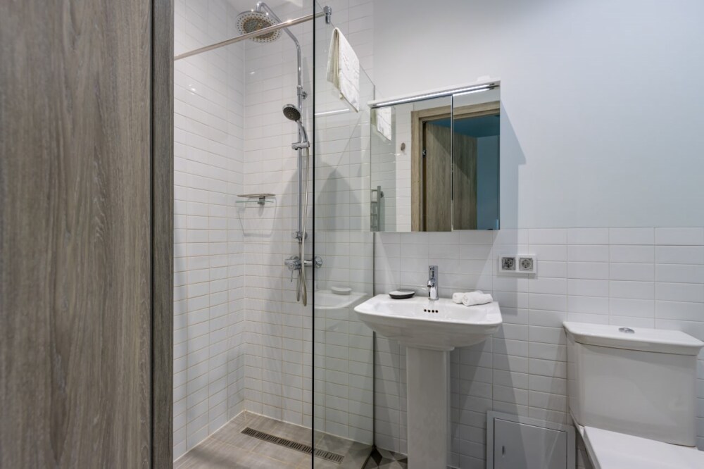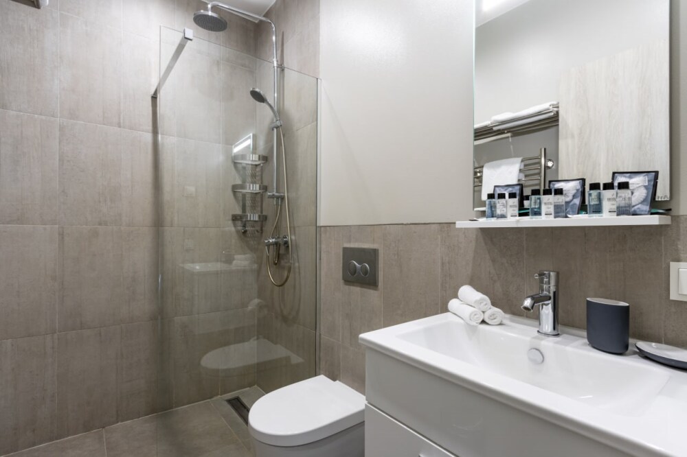 В ванной комнате – ванная или душевая кабина в зависимости от комплектации номера, стиральная машина, фен и косметические средства.