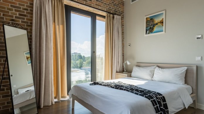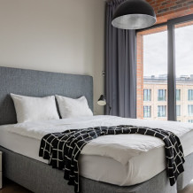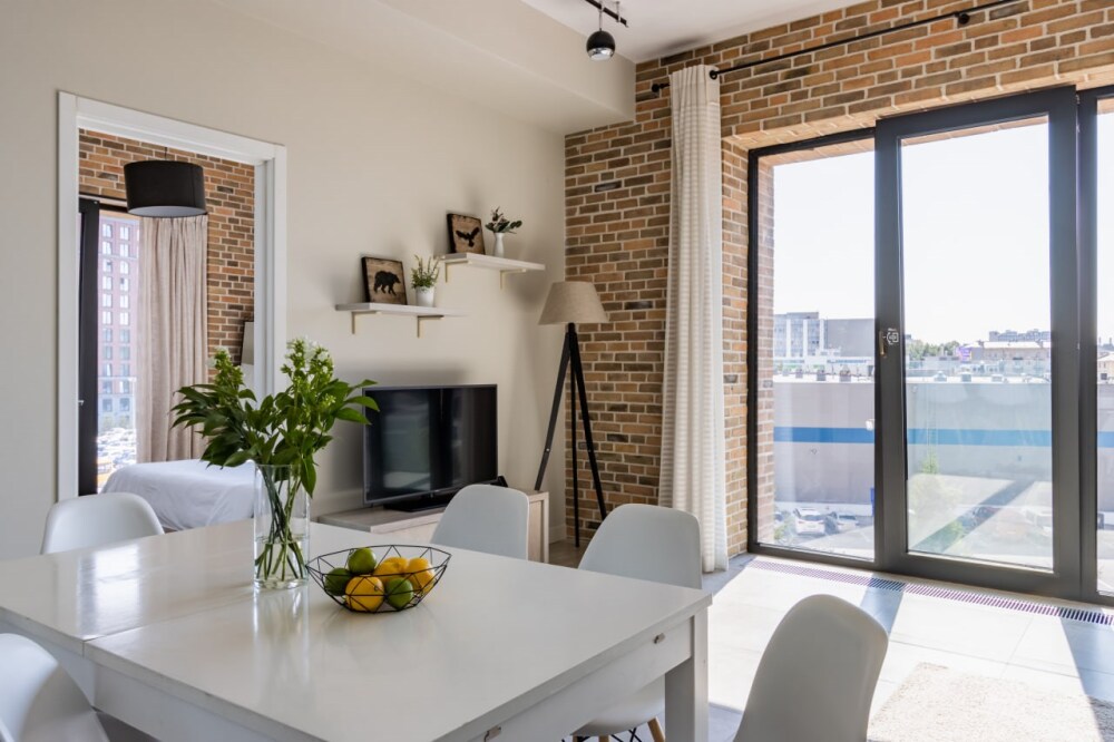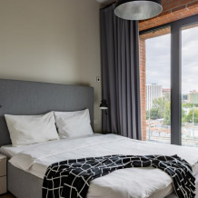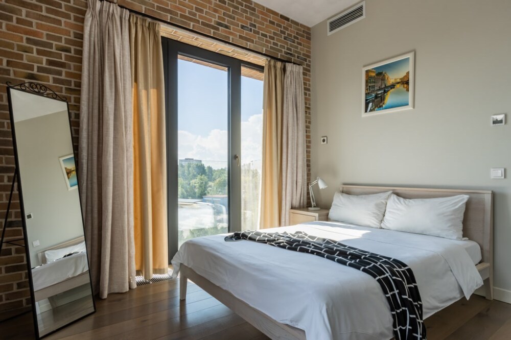 Высокие потолки, панорамные окна с французским балконом, отделка стен клинкерным кирпичом, безупречная звукоизоляция.