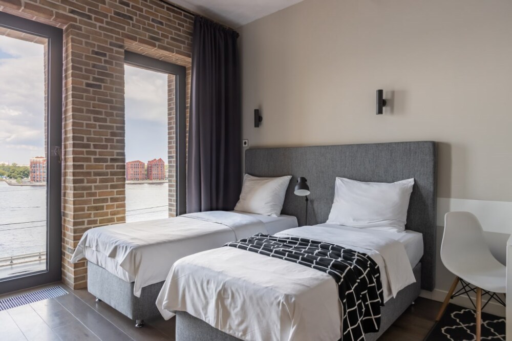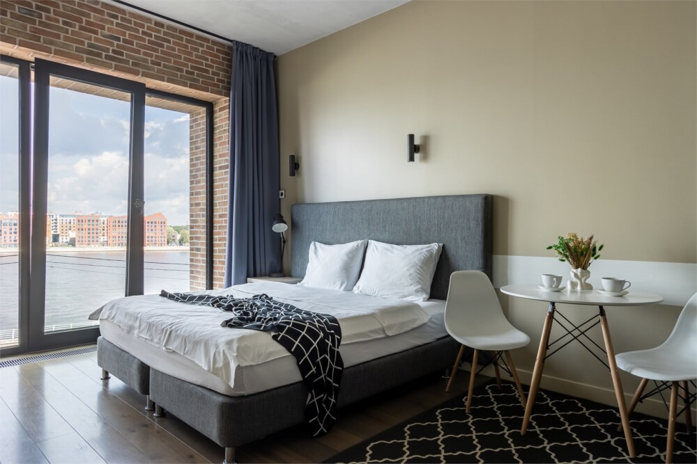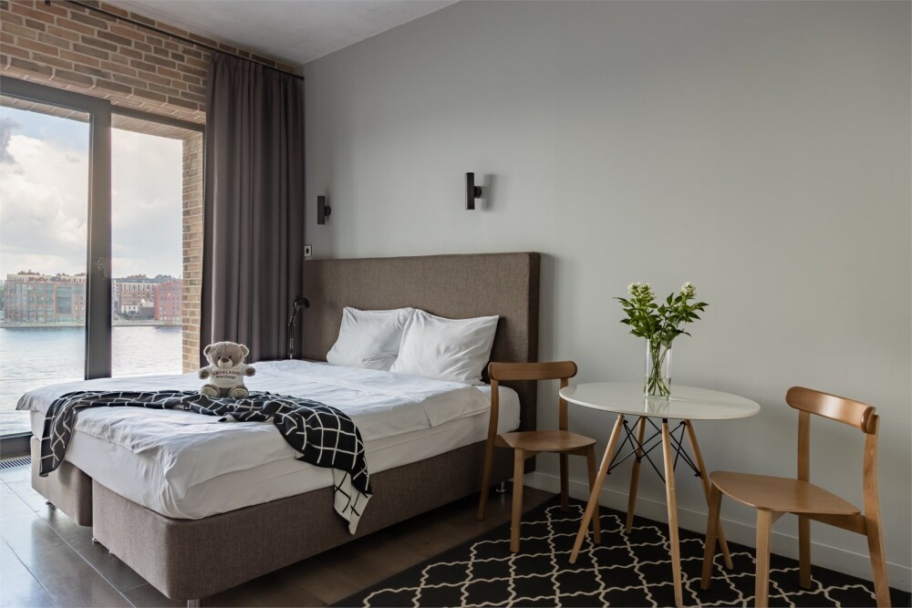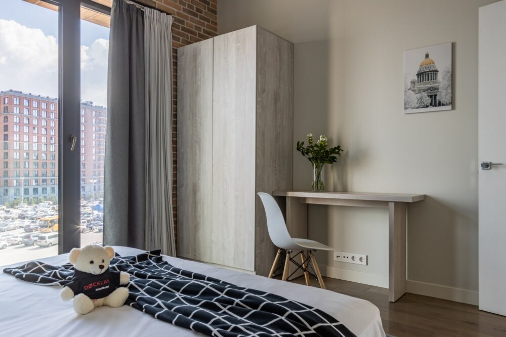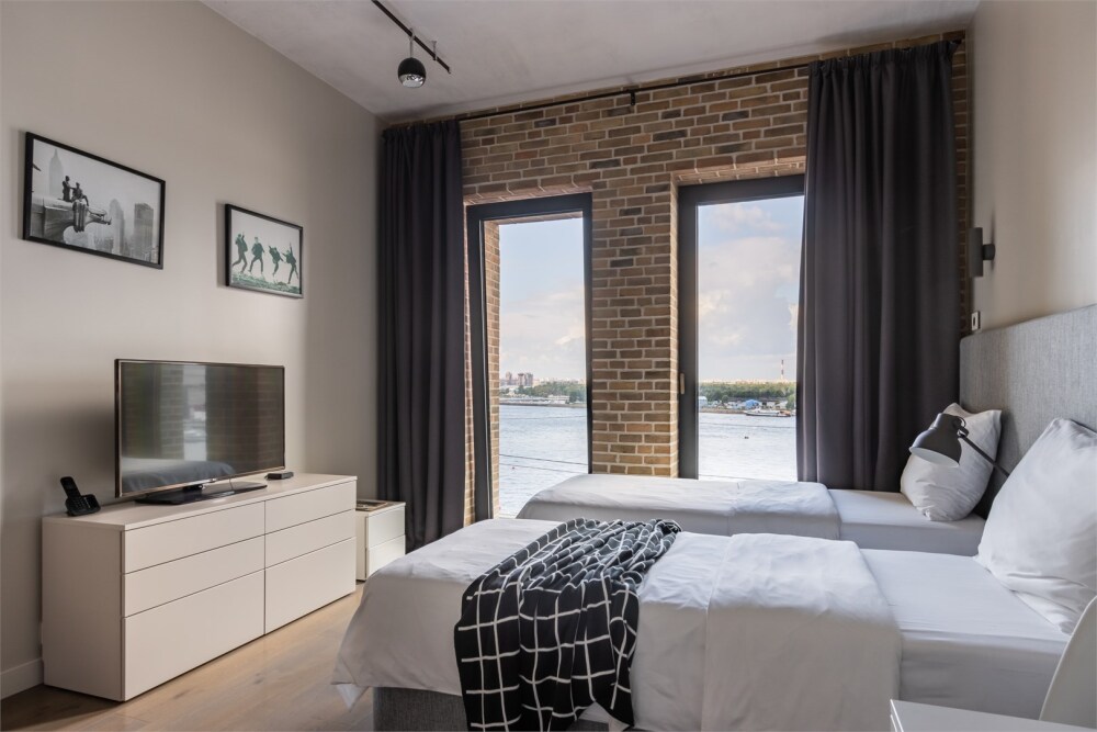 Номера расположены с 4 по 6 этаж. Окна выходят на Малую Неву, Лахта Центр и Газпром Арену. Апартаменты подойдут для размещения 1-2 гостей.
