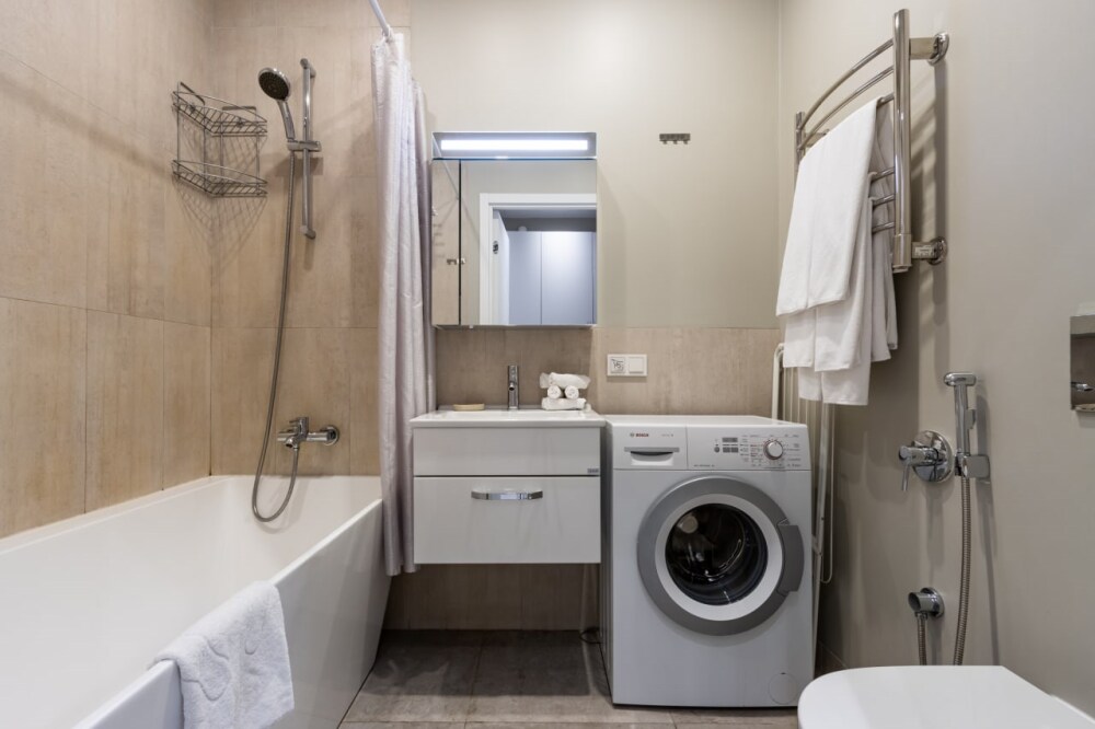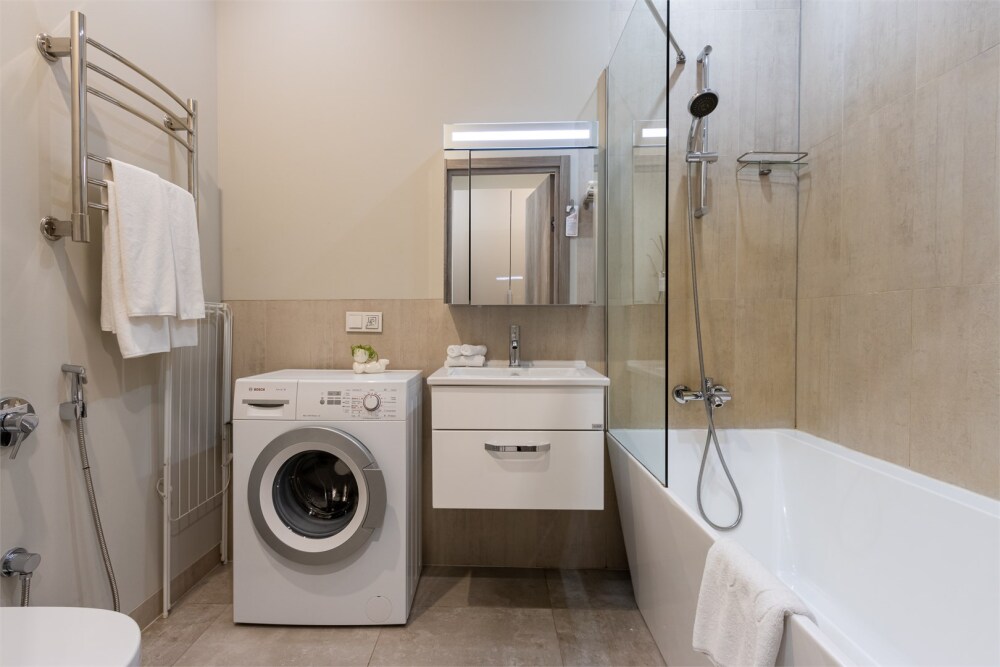 В ванной комнате – душевая кабина, стиральная машина, фен и косметические средства.