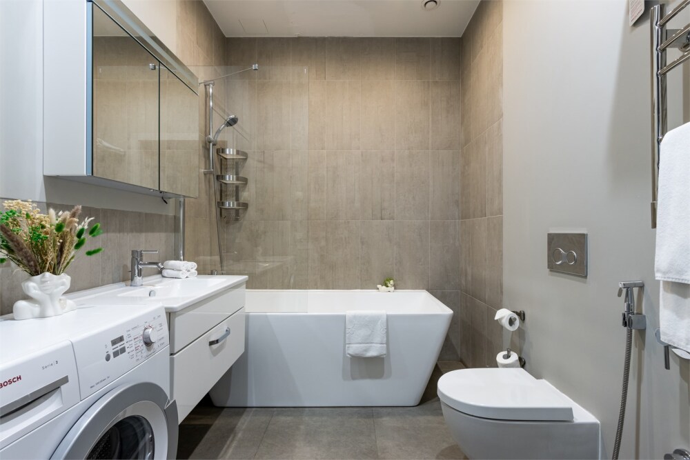 Кухня оборудована бытовой техникой для приготовления пищи и хранения продуктов. В ванной комнате – ванная, стиральная машина, фен и косметические средства.