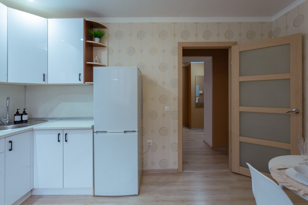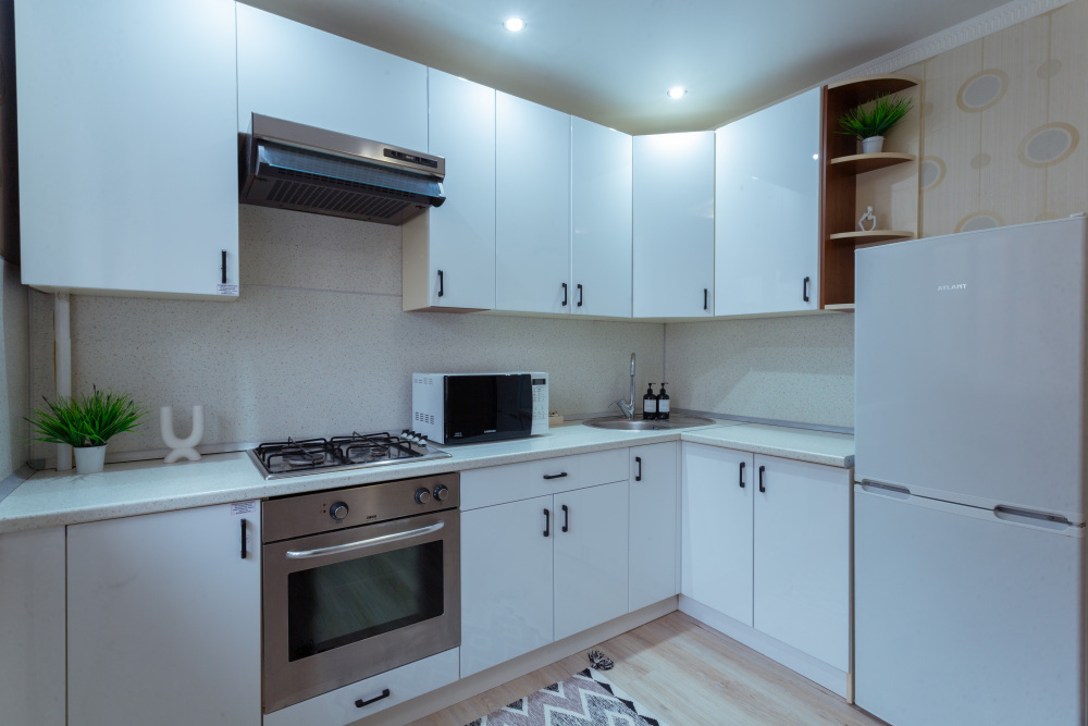 - Кухня: холодильник, плита, духовка, микроволновка, чайник, вся необходимая посуда