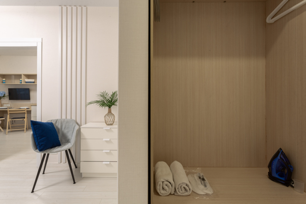 - Спальня: белоснежное бельё, одноразовые тапочки, утюг и гладильная доска;