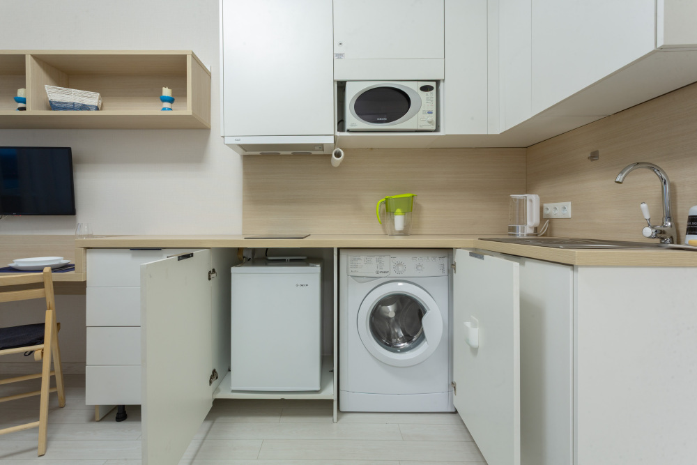 - Санузел: полный комплект гигиены, полотенца, фен, стиральная машина и водонагреватель;