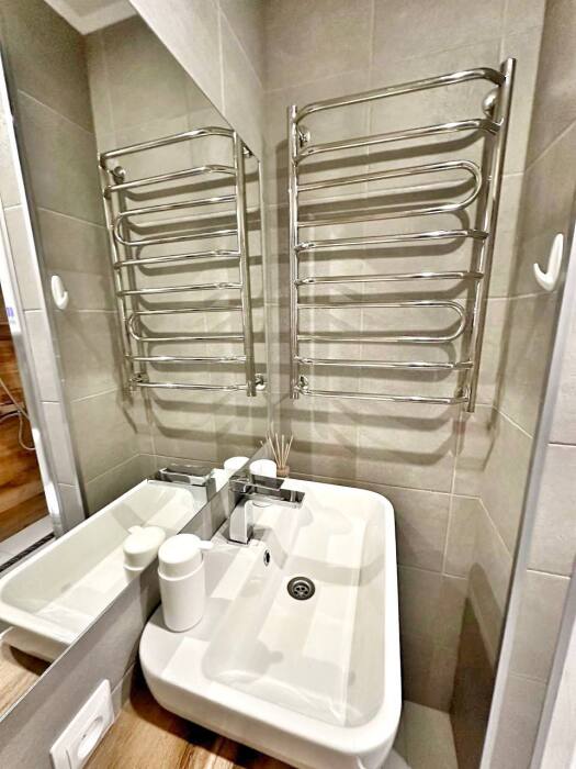 В ванной комнате: гигиенические принадлежности (шампунь, гель для душа, мыло, ватные диски и палочки), фен, утюг, гладильная доска и другие приятные мелочи.
