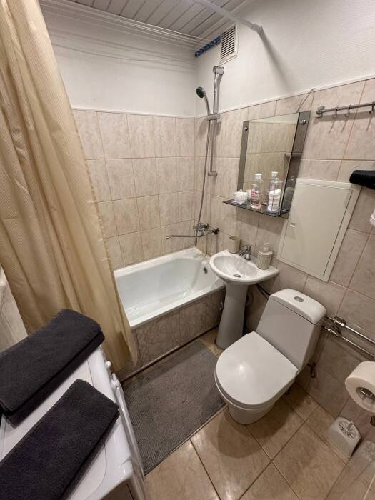 В ванной комнате: гигиенические принадлежности (шампунь, гель для душа, мыло, ватные диски и палочки), фен. Стиральная машина, утюг, гладильная доска и другие приятные мелочи.