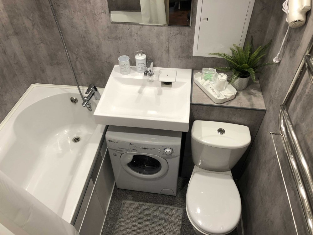 В ванной комнате: гигиенические принадлежности (шампунь, гель для душа, мыло, ватные диски и палочки), фен. Стиральная машина, утюг, гладильная доска и другие приятные мелочи.