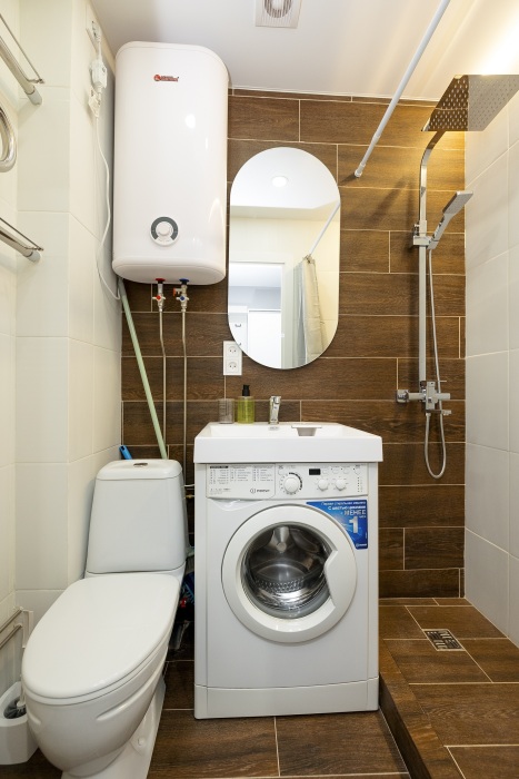 В ванной комнате: гигиенические принадлежности (шампунь, гель для душа, мыло, ватные диски и палочки), фен. Стиральная машина, утюг, гладильная доска и другие приятные мелочи.