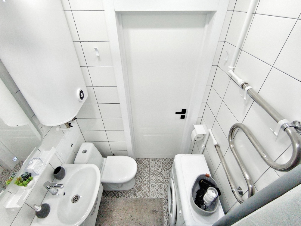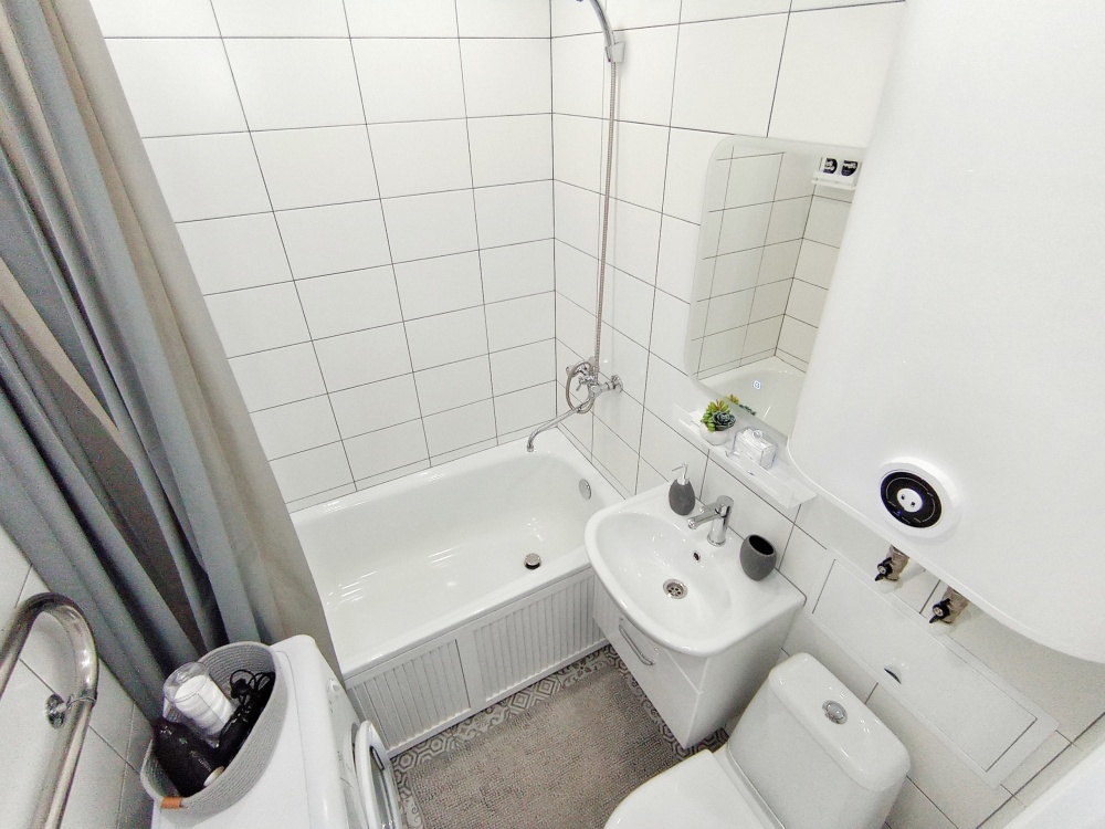 В ванной комнате: ванна, гигиенические принадлежности (шампунь, гель для душа, мыло, ватные диски и палочки), фен, стиральная машина, утюг, гладильная доска и другие приятные мелочи.