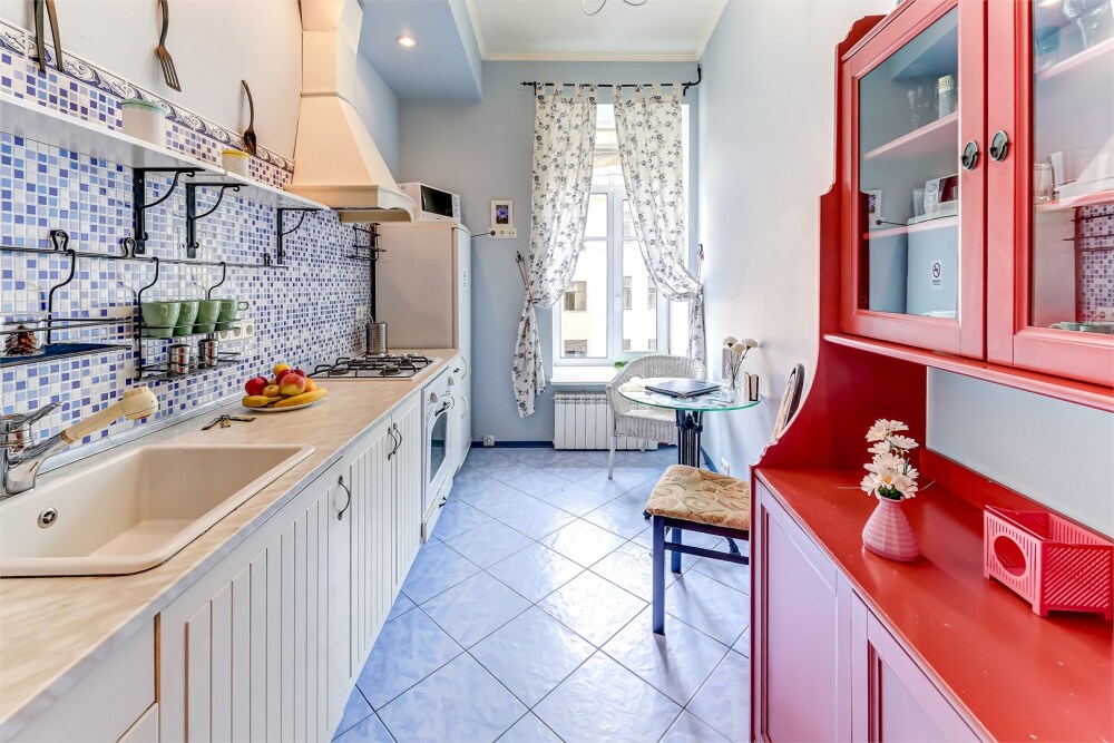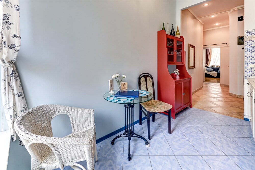 Просторные двухкомнатные апартаменты имеют нестандартную круговую планировку. Большие окна, украшенные легкими тюлевыми занавесками и тяжелыми бордовыми шторами, впускают в комнату достаточно естественного света, создавая ощущение простора. В спальне - большая кровать с изящным кованым изголовьем, украшенным завитками. На кухне - красная буфетница, словно солнечный луч, врывающийся в пространство. Апартаменты создают впечатление уютного и стильного жилья, идеально подходящего для комфортного отдыха.