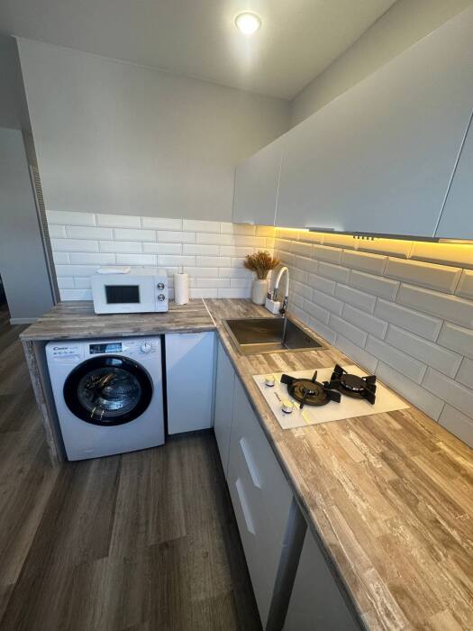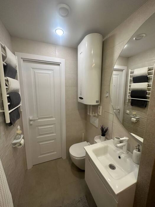 В ванной комнате: гигиенические принадлежности (шампунь, гель для душа, мыло, ватные диски и палочки), фен. Стиральная машина, утюг, гладильная доска и другие приятные мелочи. На сезонные отключения горячей воды предусмотрен бойлер на 80 литров.