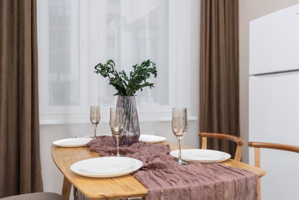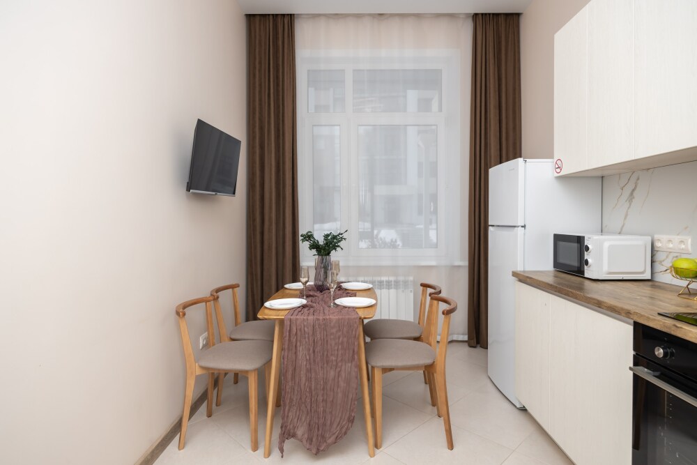 Полностью оборудованные кухни с посудой и столовыми приборами.