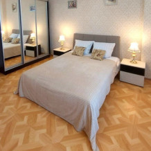 Три просторные комнаты: 2 спальни с двуспальными кроватями 160х200, гостиная с двумя двуспальными диванами 300х150 и 200х150, кухня со всем необходимым оборудованием, имеющая выход на балкон с видом на город и Волгу.