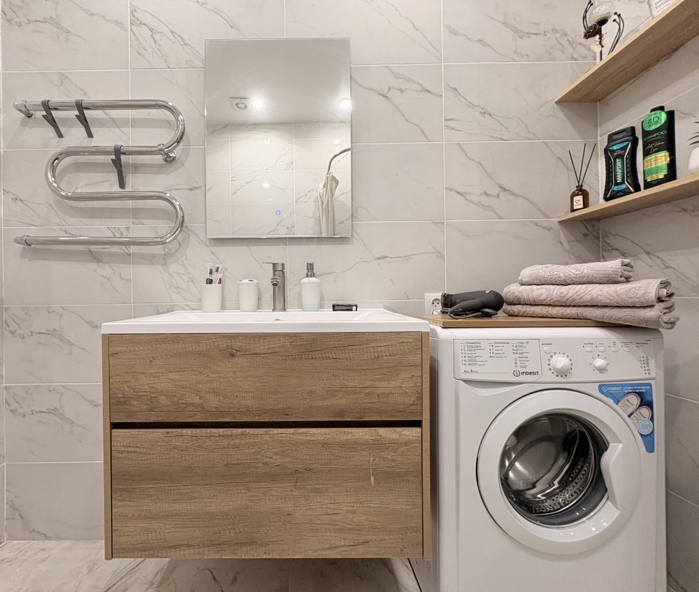 - техника: стиральная машина, индивидуальное отопление, кондиционер, плита, холодильник, микроволновая печь, электрочайник, утюг, фен ,сушилка для белья, гладильная доска и пылесос;