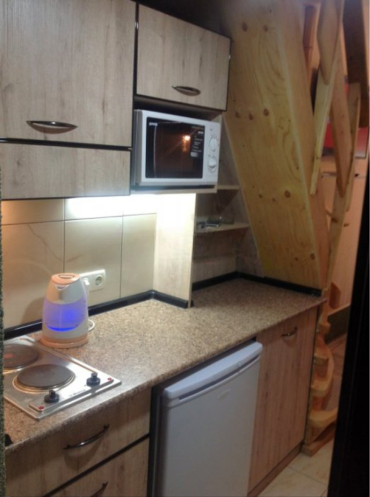 Пластиковая мебель для отдыха на балконе; электроплита, микроволновая печь, полный комплект посуды, посудомоечная машина, стиральная машина-автомат.