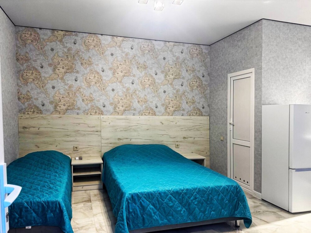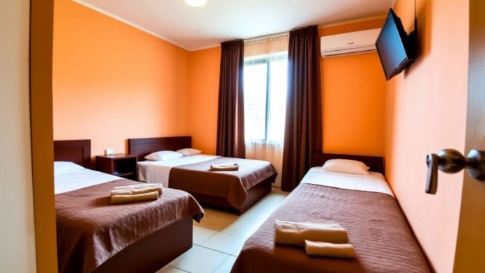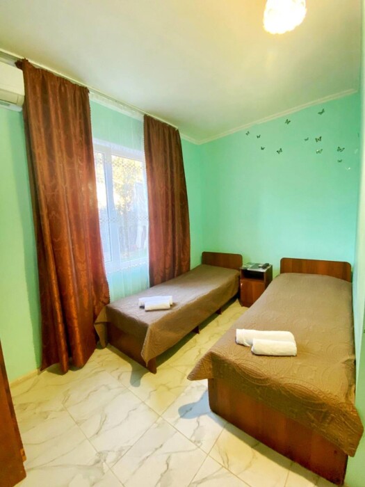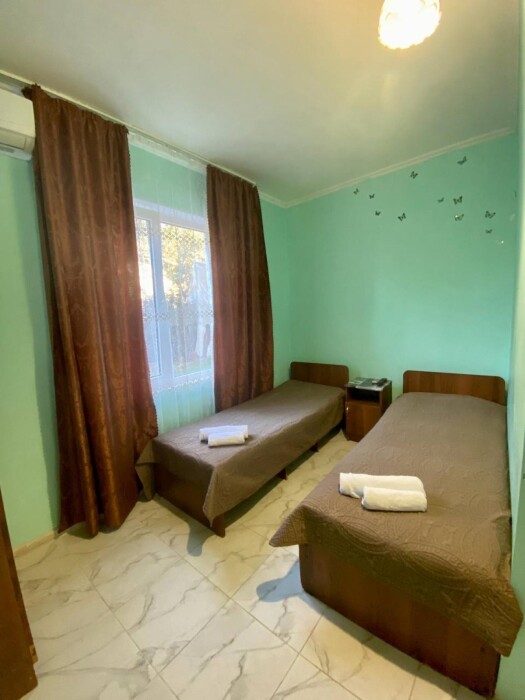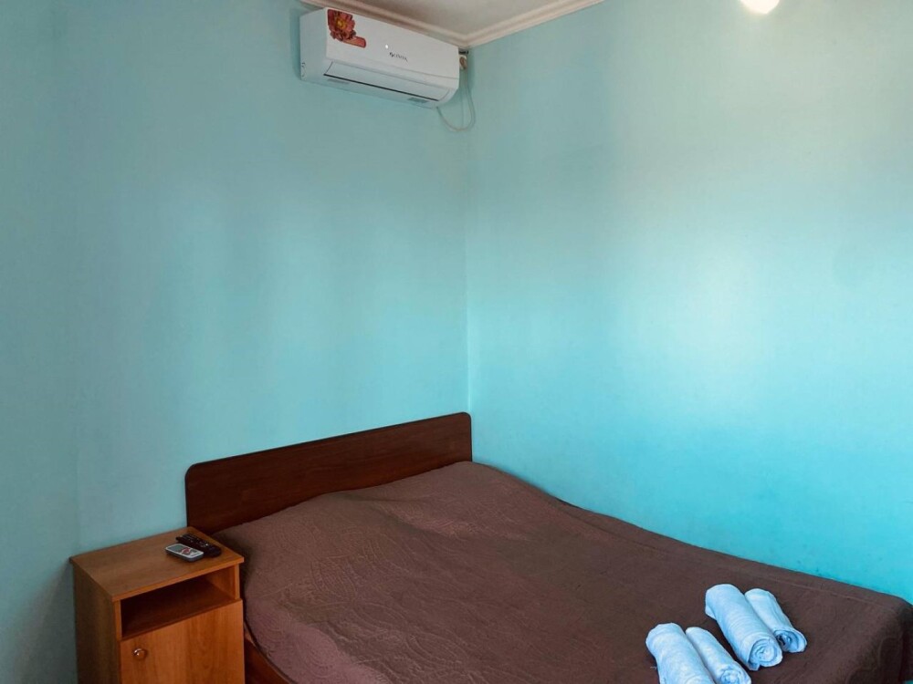 В номере есть двуспальная и несколько односпальных кроватей, постельное белье, полотенца, телевизор и кондиционер. Санузел расположен в номере.