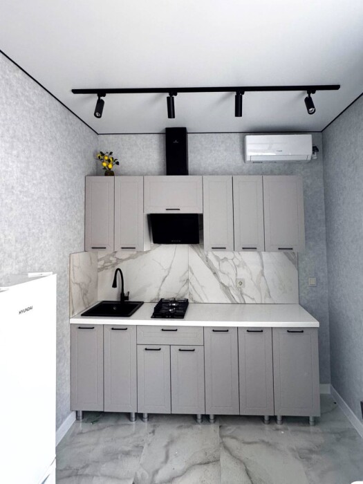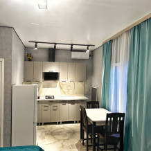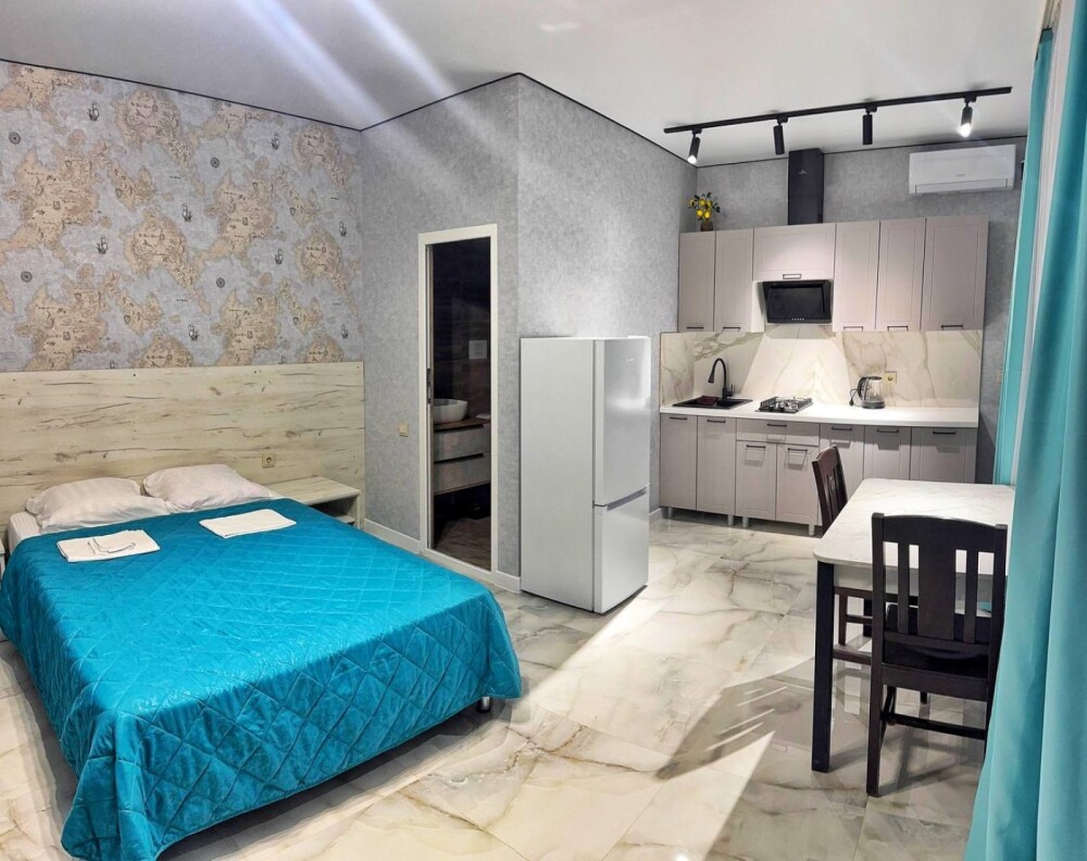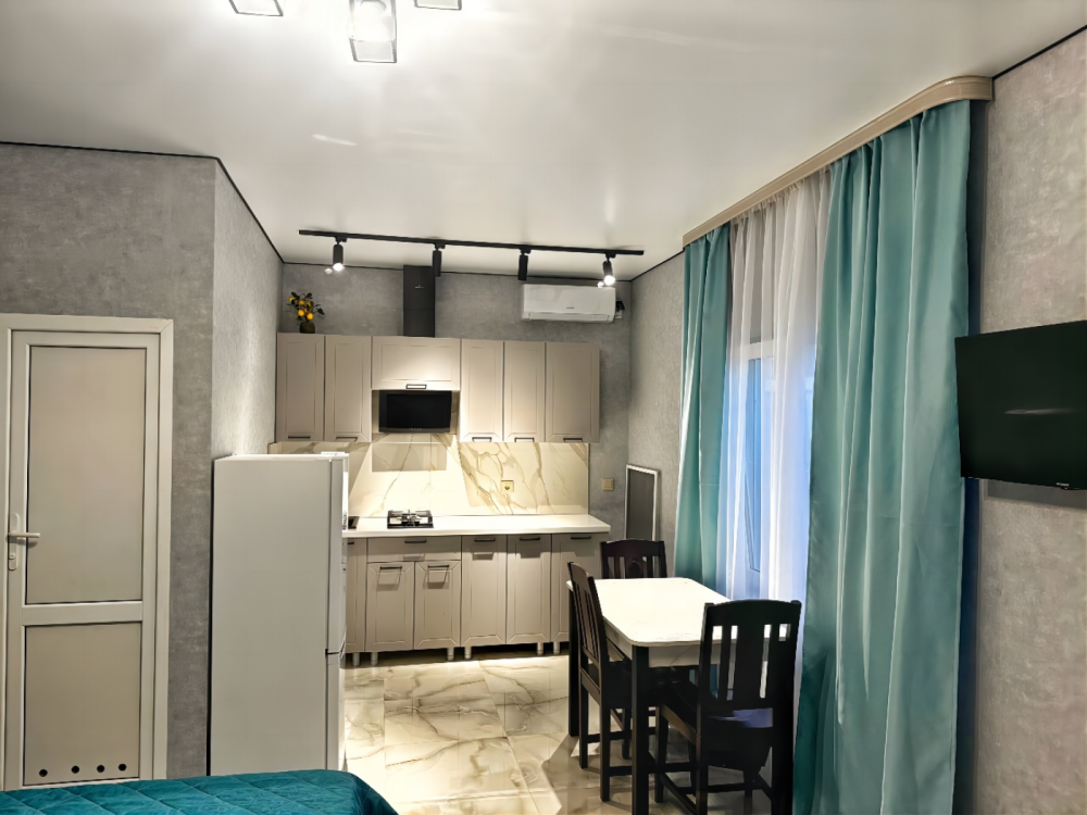 В студии есть двуспальная и односпальная кровать, кухонная зона, телевизор и кондиционер. Санузел расположен в номере.