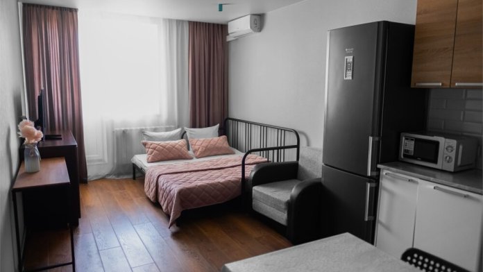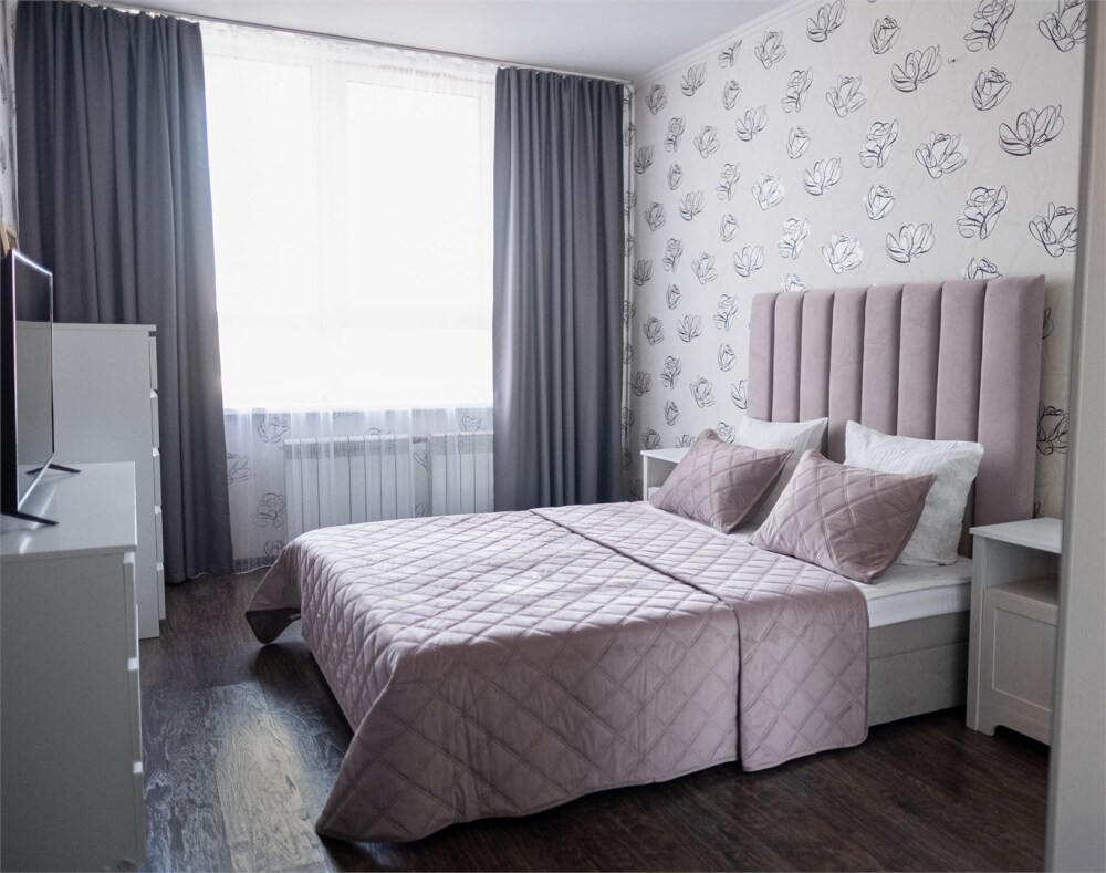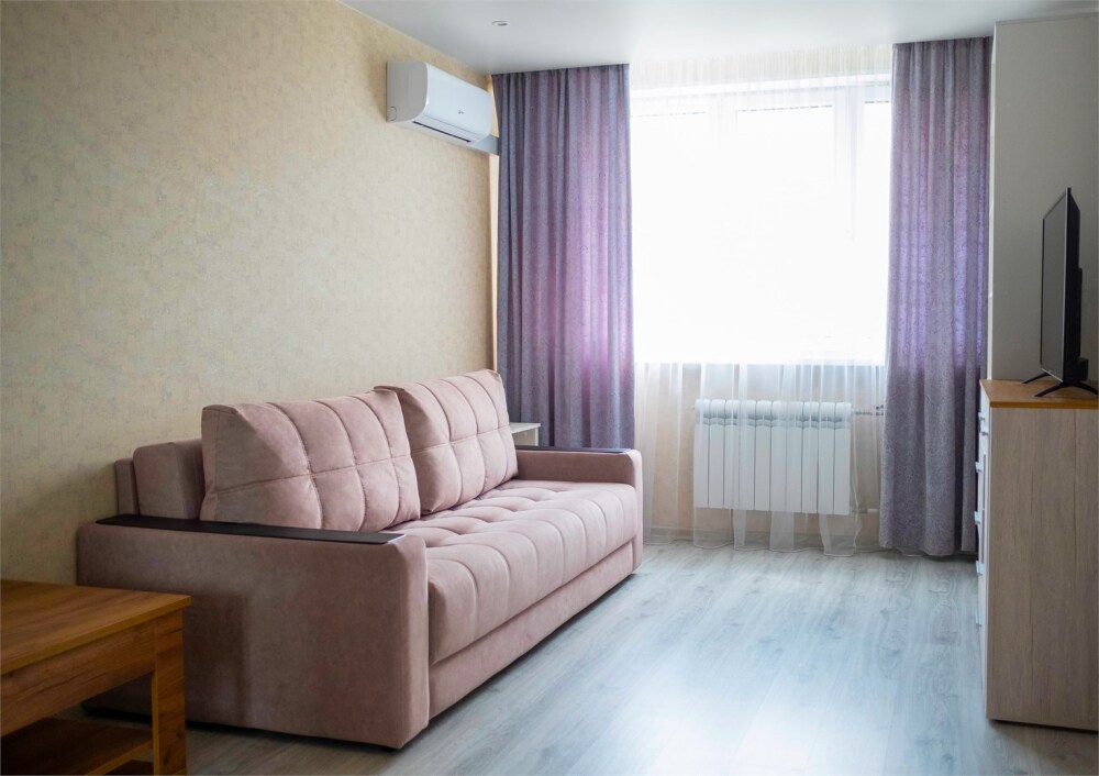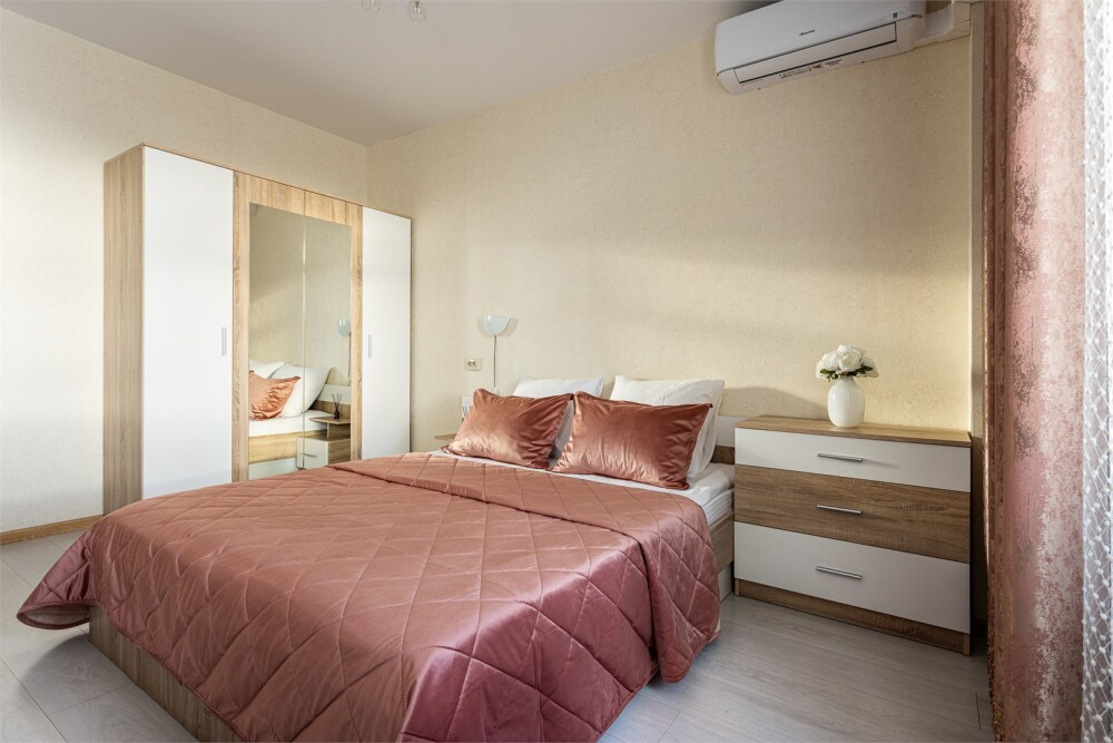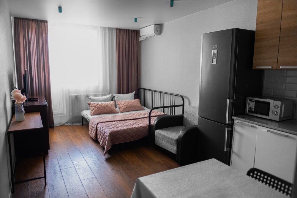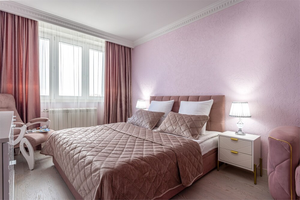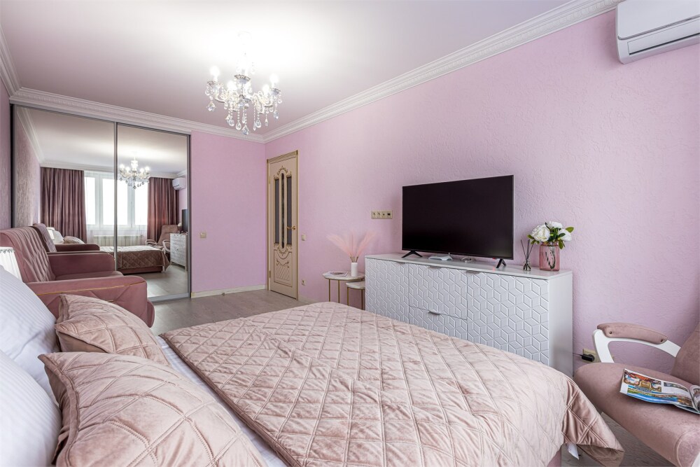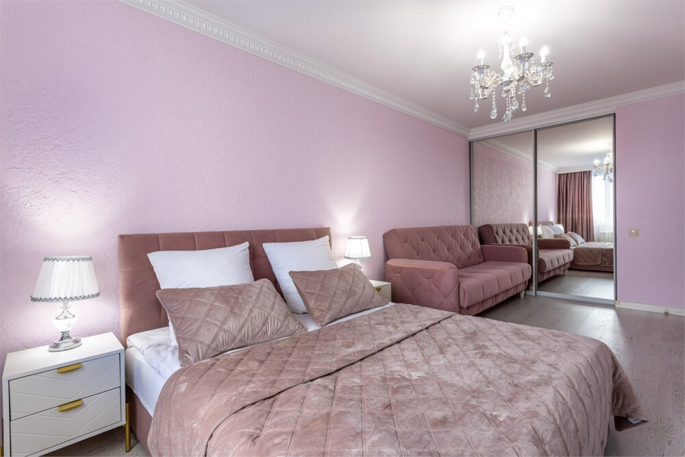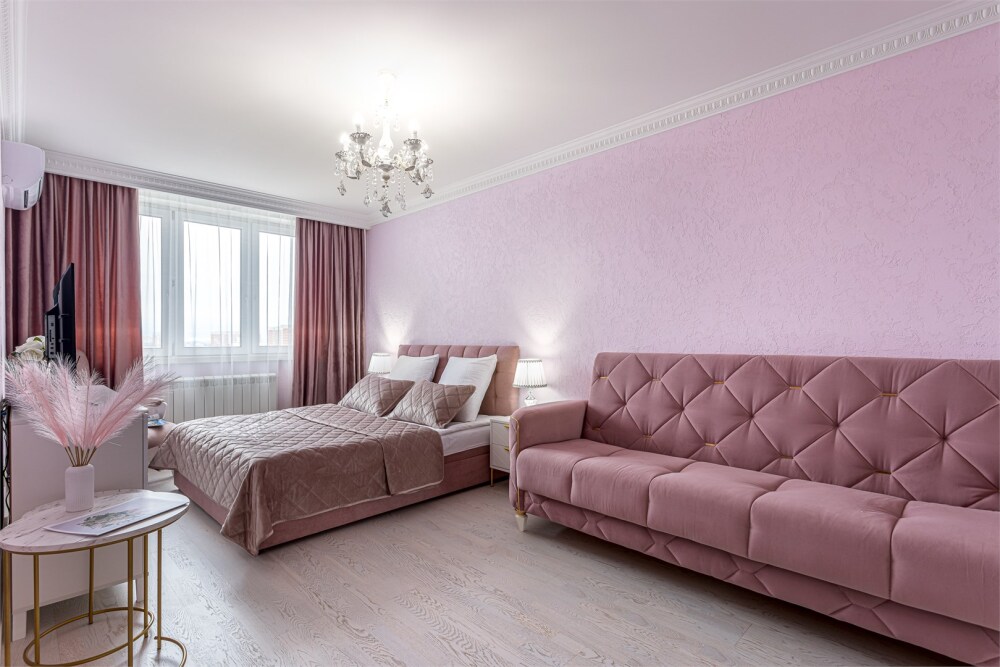 Светлая уютная квартира в нежно розовых оттенках прекрасно подойдет для одиночного размещения.