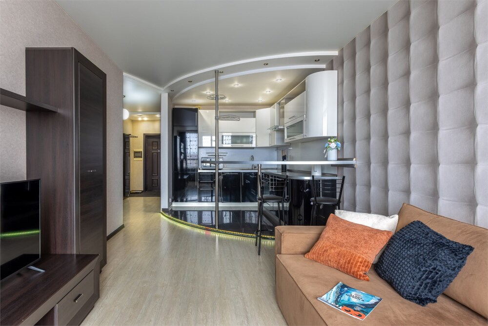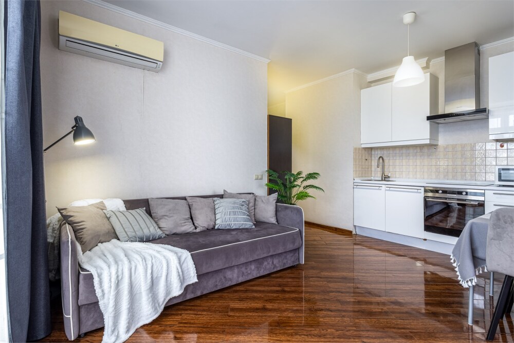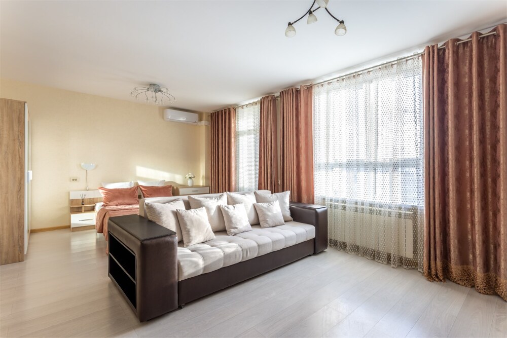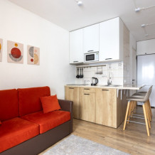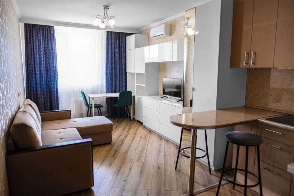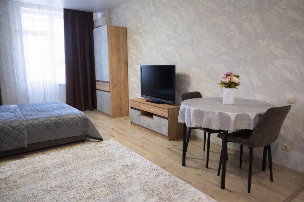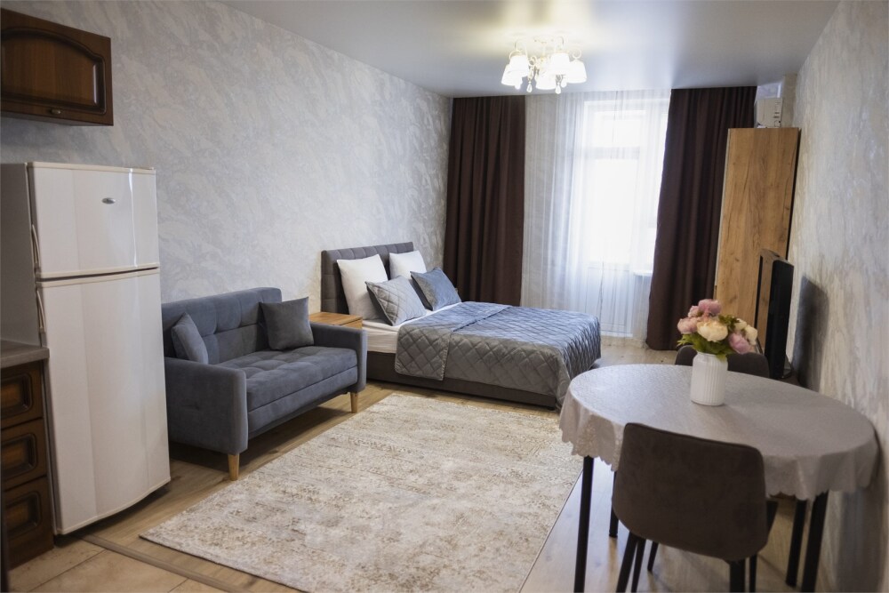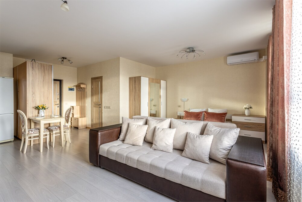Просторная квартира-студия без балкона для некурящих. Уютная обеденная зона и гостиная для приятного отдыха в кругу семьи и друзей.