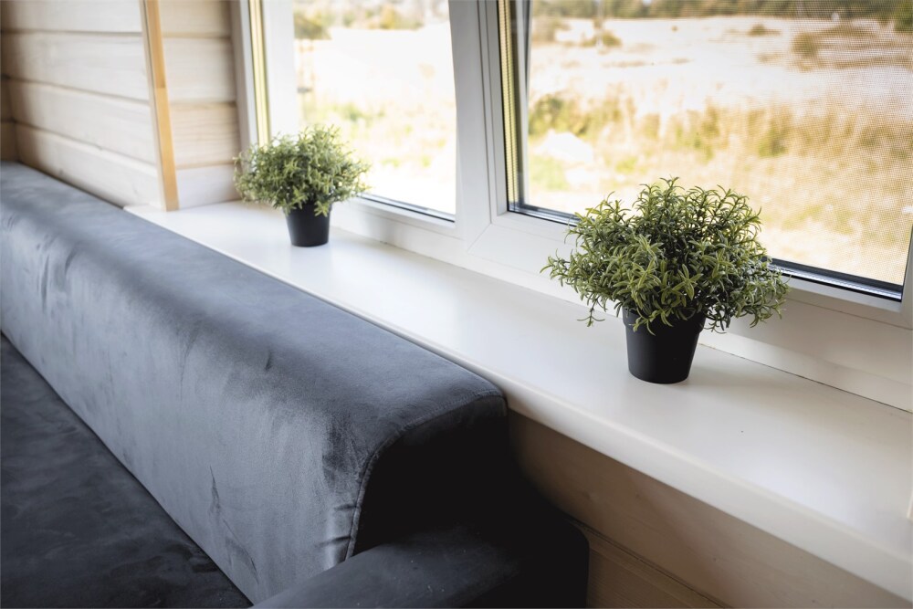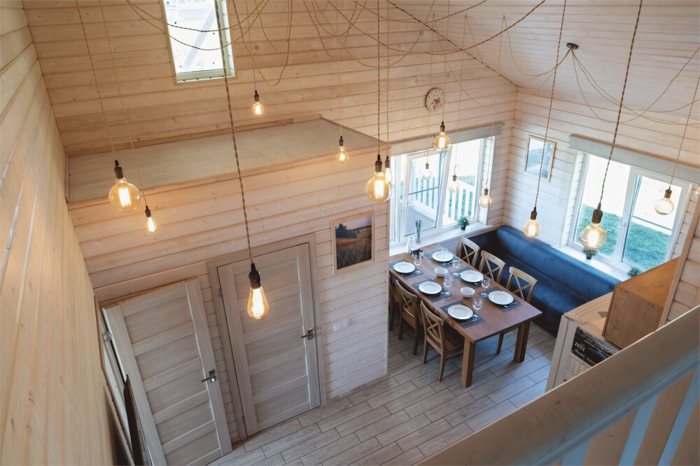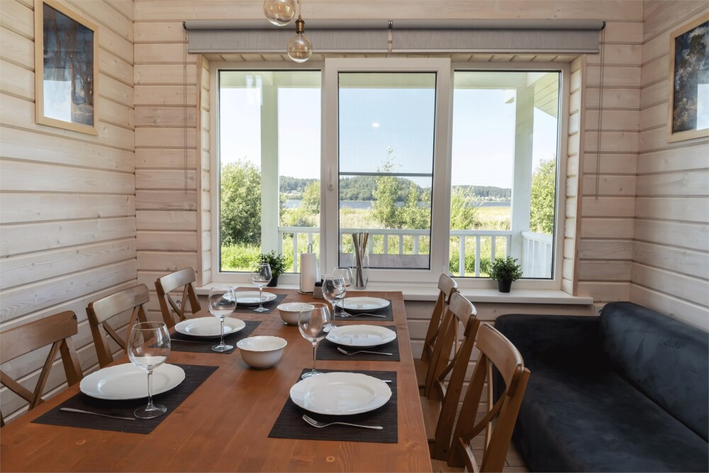 Тёплый, светлый, уютный, скандинавский интерьер дома с панорамными окнами и видом на залив.