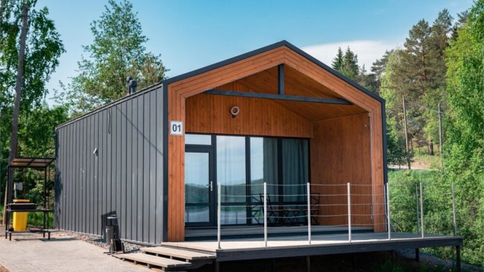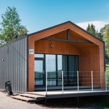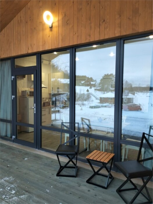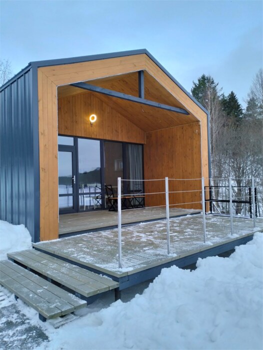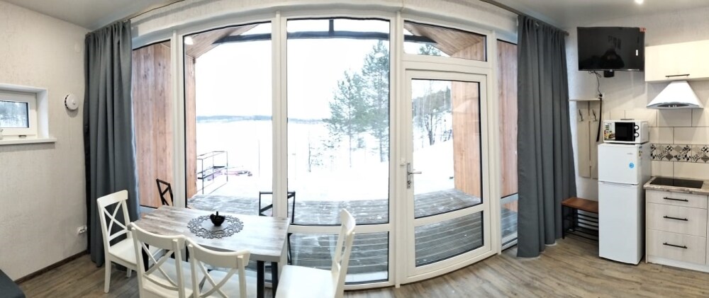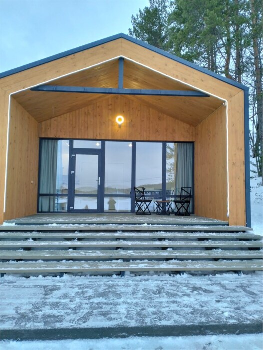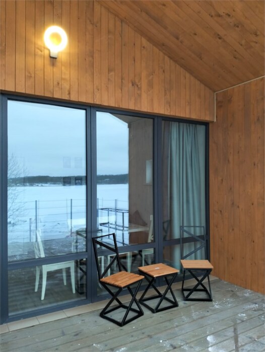 «Черная жемчужина 45м² Барн» — дом до 4 гостей (2 гостя в спальне и 2 гостя в гостиной) с панорамными окнами на залив. Находится в Сортавала, поселок Токкарлахти.