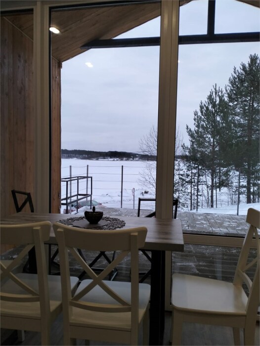 Тёплый, светлый, уютный, скандинавский интерьер дома с панорамными окнами и видом на залив.