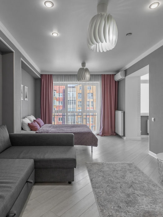 Уютный лофт с панорамными окнами из спальни в ЖК «Московский квартал».