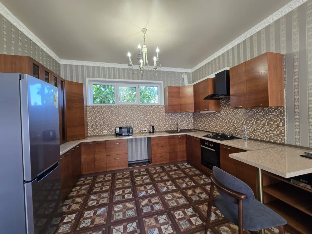 Кухня-гостиная: просторная, объединенная зона с полным комплектом техники и посуды.