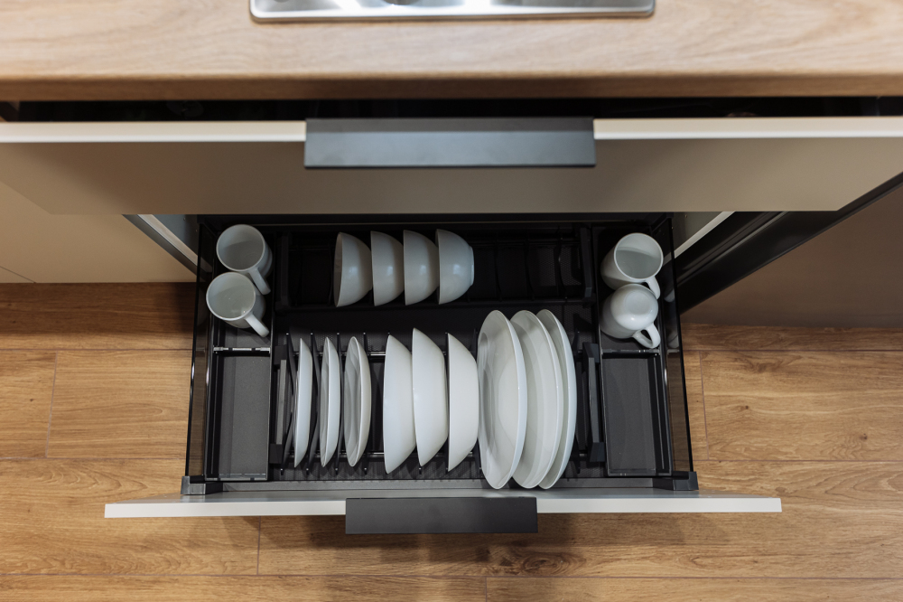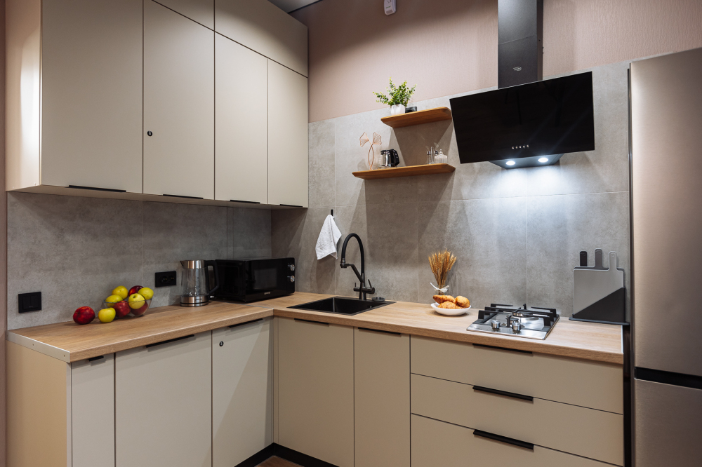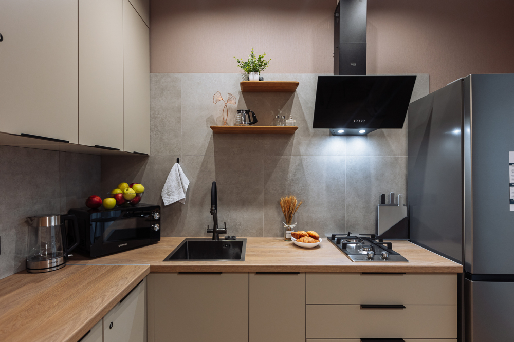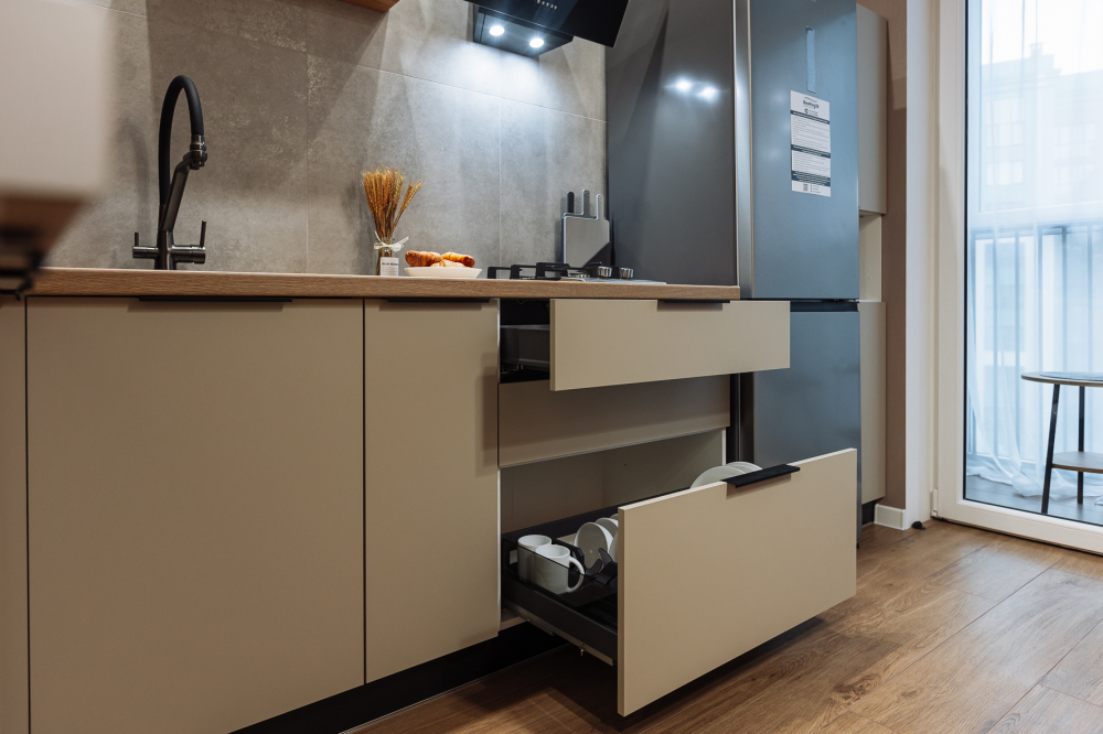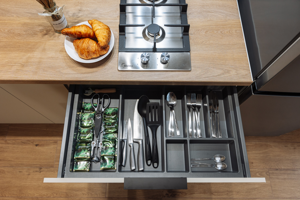 - На кухне: посуда, столовые приборы, кастрюли и сковородки, микроволновка, холодильник, чайник, посудомоечная машина и газовая плита;