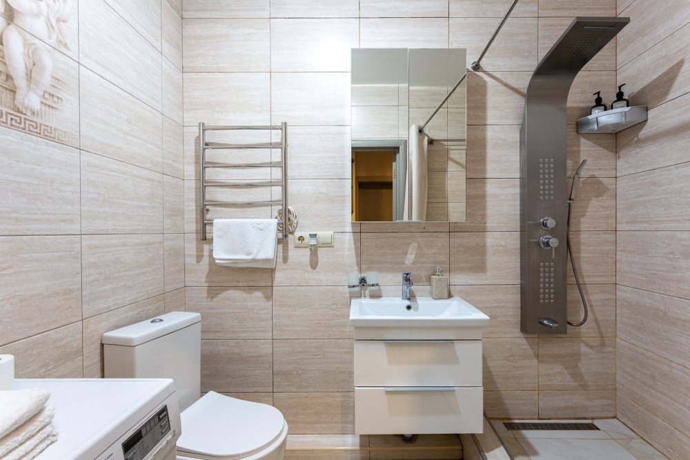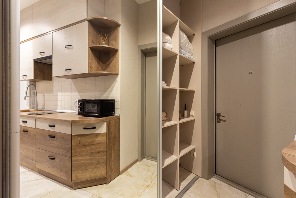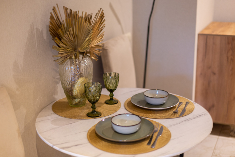 Кухня полностью оборудована для комфортного проживания: варочная панель, духовой шкаф, микроволновая печь, холодильник, чайник, посуда и кухонные принадлежности. Подходит как для коротких поездок, так и для длительного проживания. Современный санузел оснащён душевой зоной, раковиной, зеркалом и стиральной машиной. Гостям предоставляются полотенца и базовый набор удобств. Для семей с детьми предусмотрена детская кроватка. Обратите внимание: постельное бельё для детской кроватки не предоставляется.