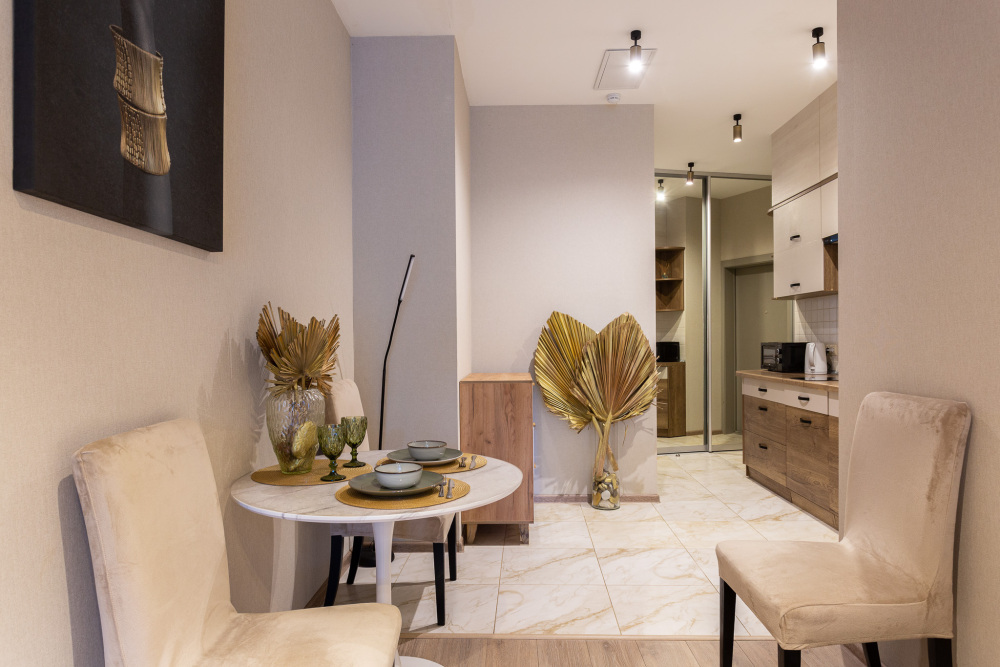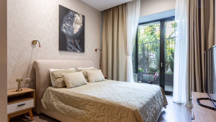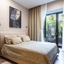 Апартаменты выполнены в современном стиле с продуманным зонированием. В спальной зоне - двуспальная кровать с удобным матрасом, в гостиной - раскладной диван, телевизор и уютная зона отдыха. Есть выход на просторную лоджию, где приятно провести время.