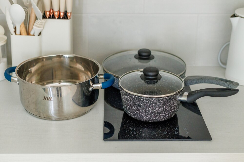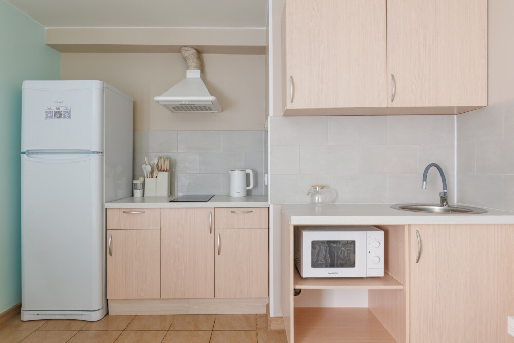 Кухонная зона оснащена современной техникой и удобным кухонным столом, что делает её идеальной для приготовления и приема пищи.