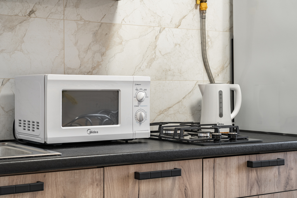 - Микроволновка и варочная поверхность для удобного приготовления пищи.