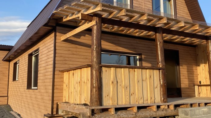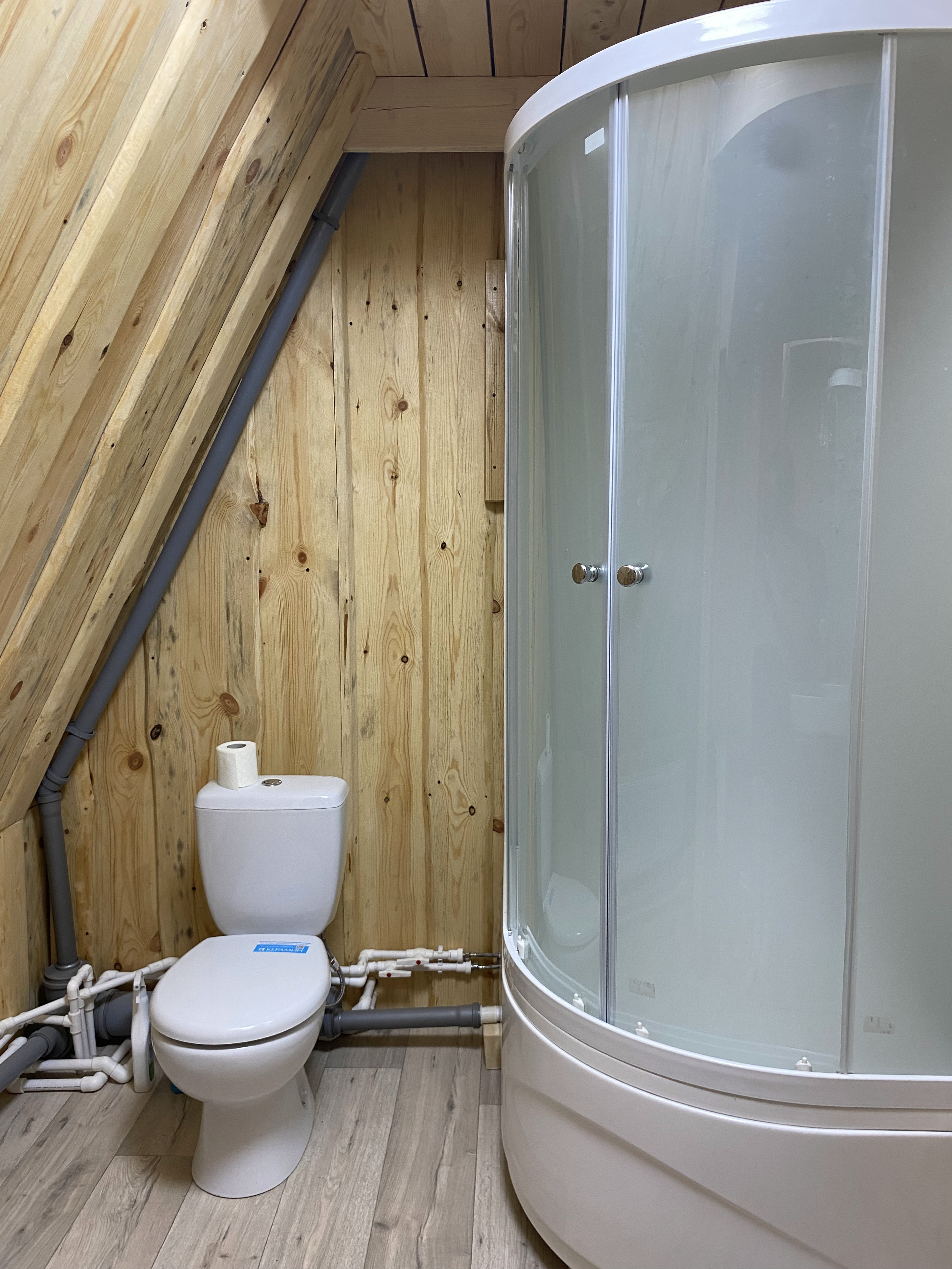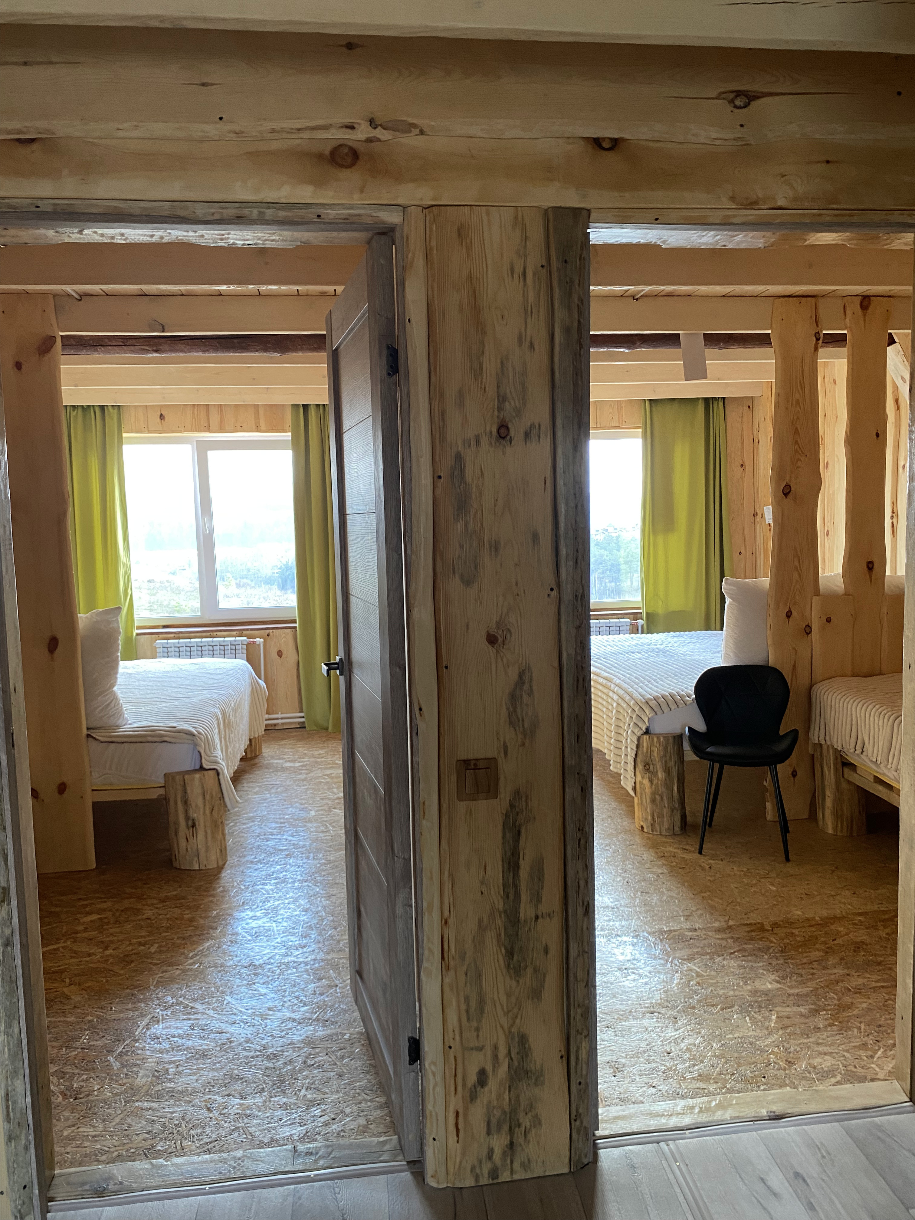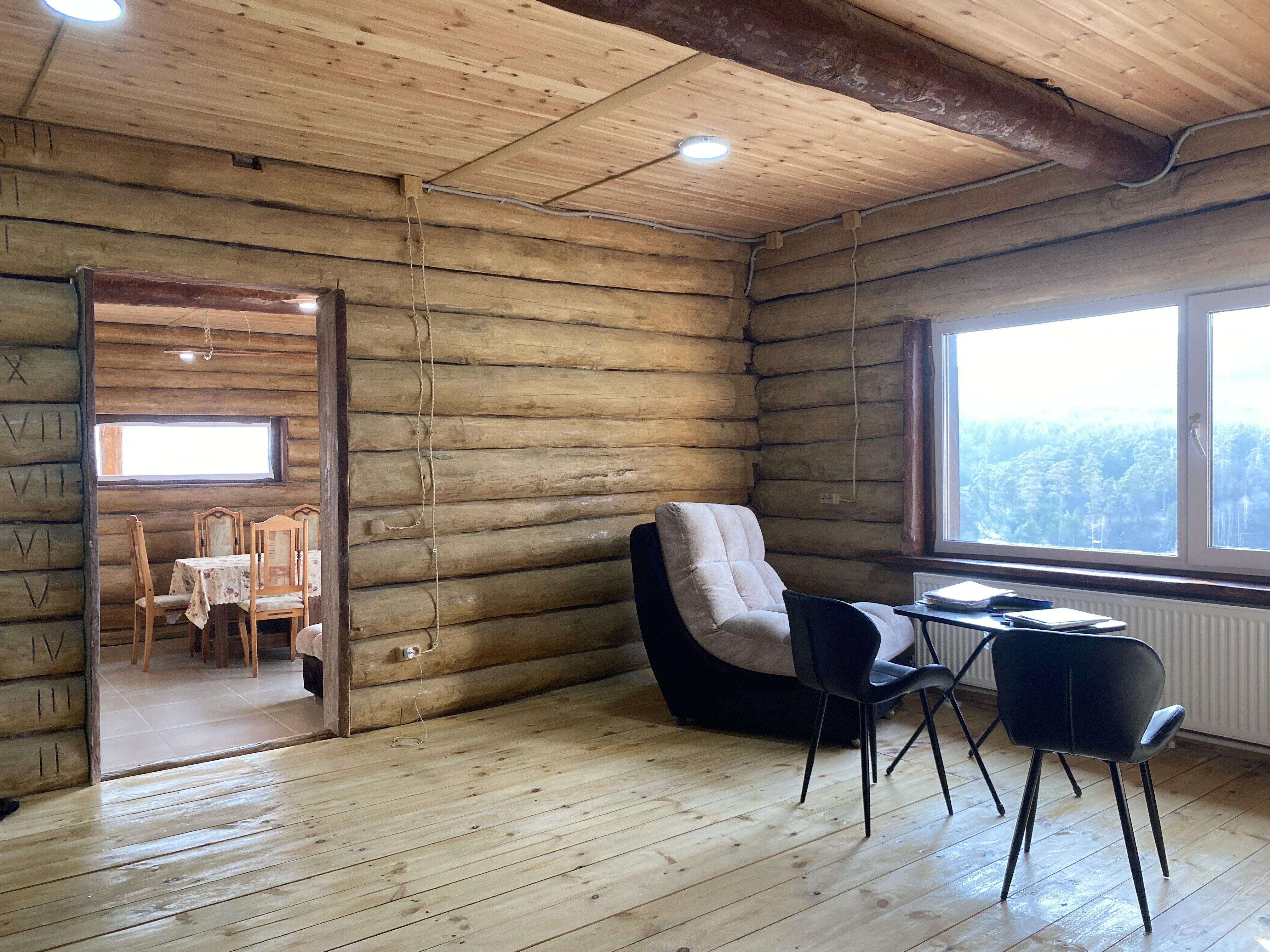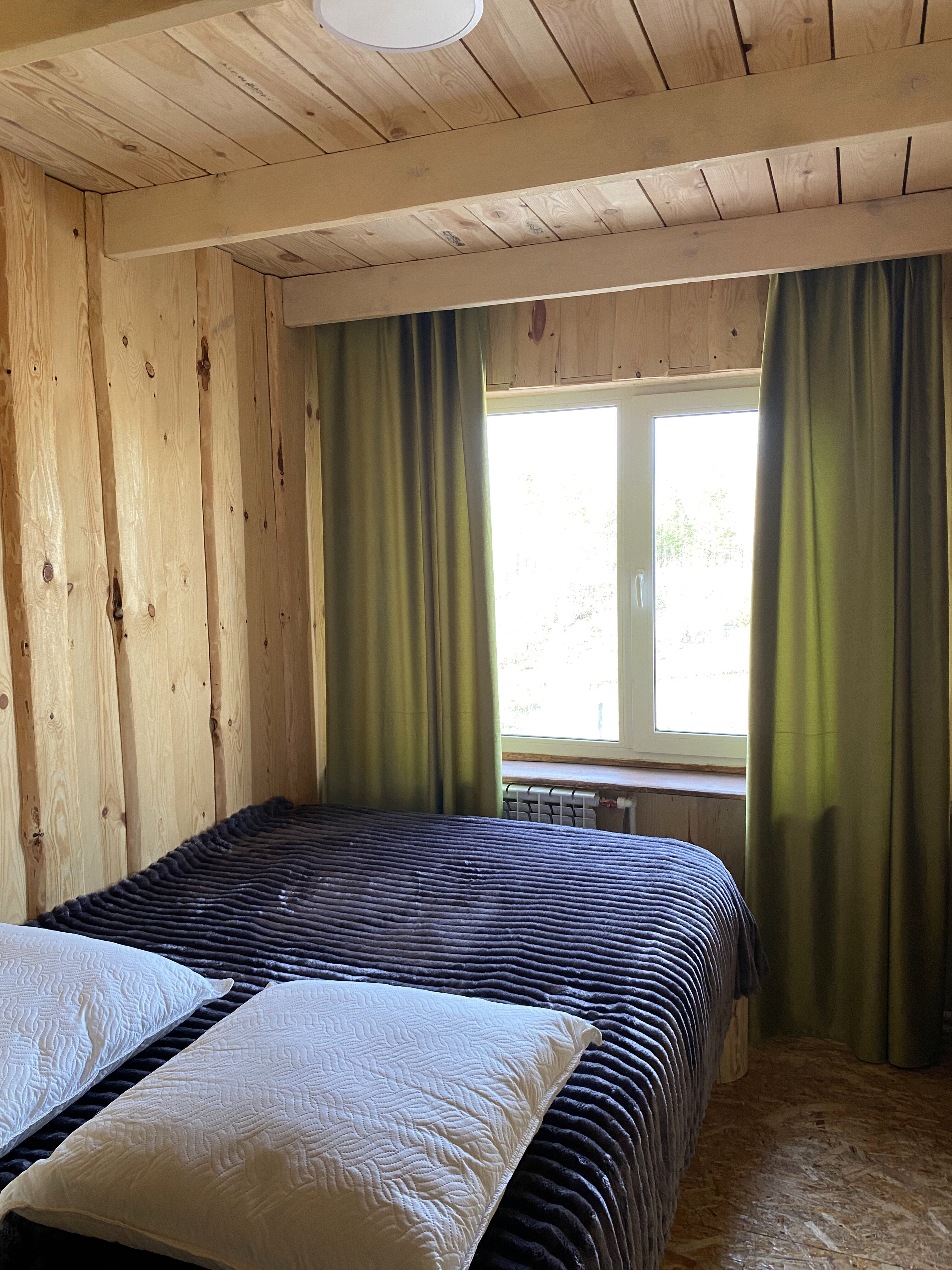 Теперь о самом доме. Дом деревянный, просторный, теплый уютный. На первом этаже гостиная, комната отдыха, сауна, сан узел. На втором этаже три спальни. В двух спальнях стоят двуспальная и односпальная кровати, в третьей двуспальная кровать. И просторная ванная комната с душевой кабиной.