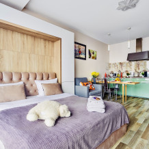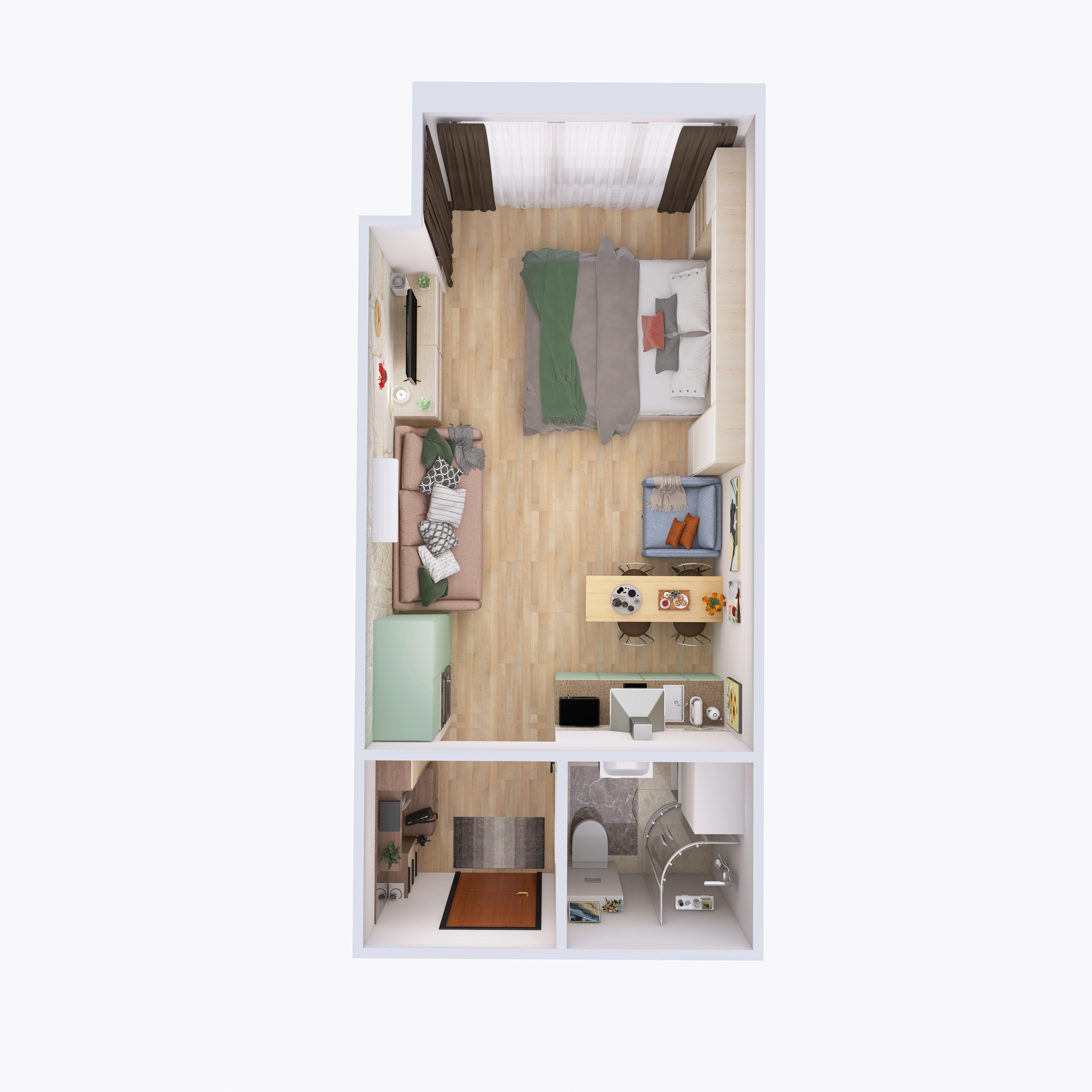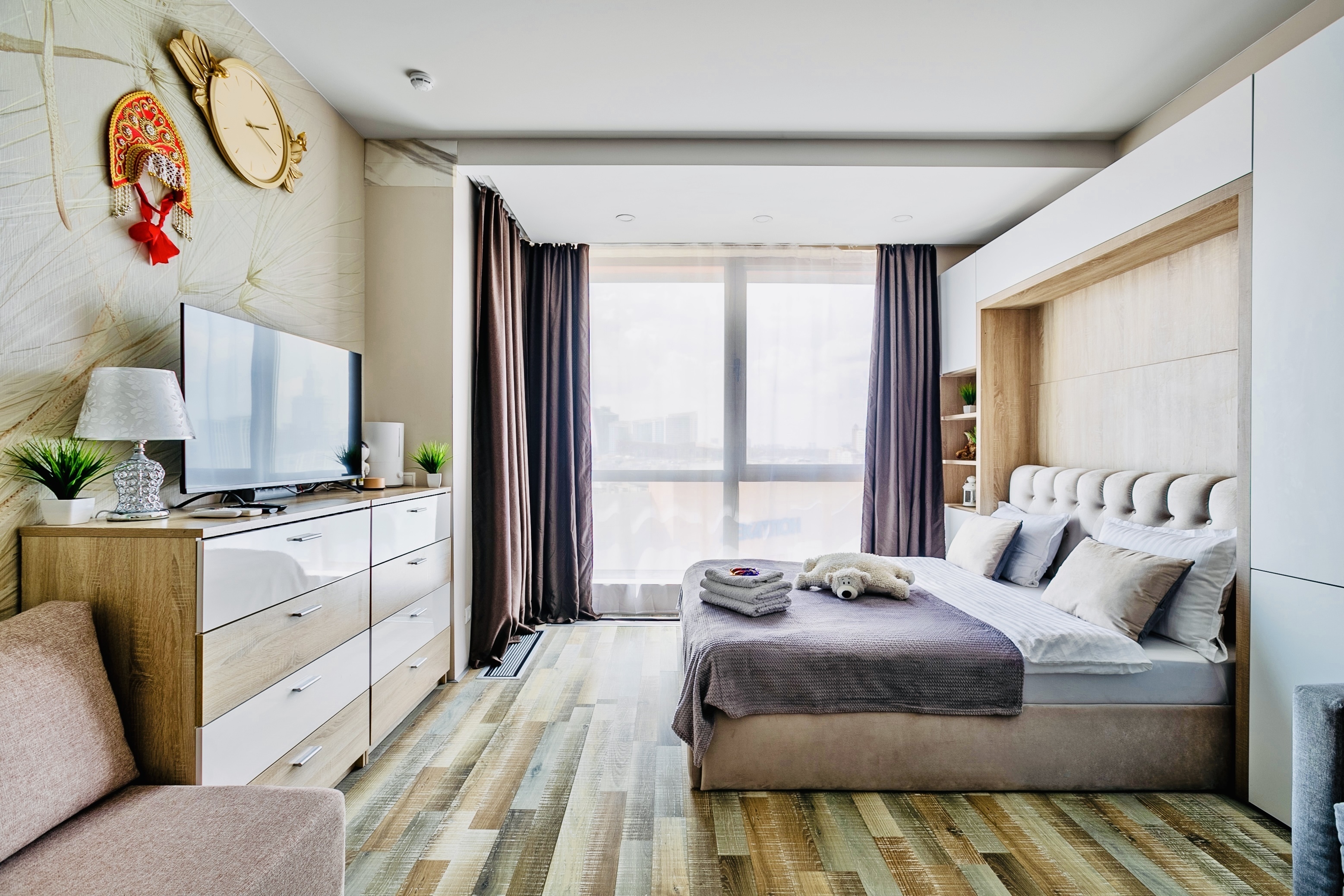 - Спальня: большая кровать 160×200 см (ортопедический матрас).