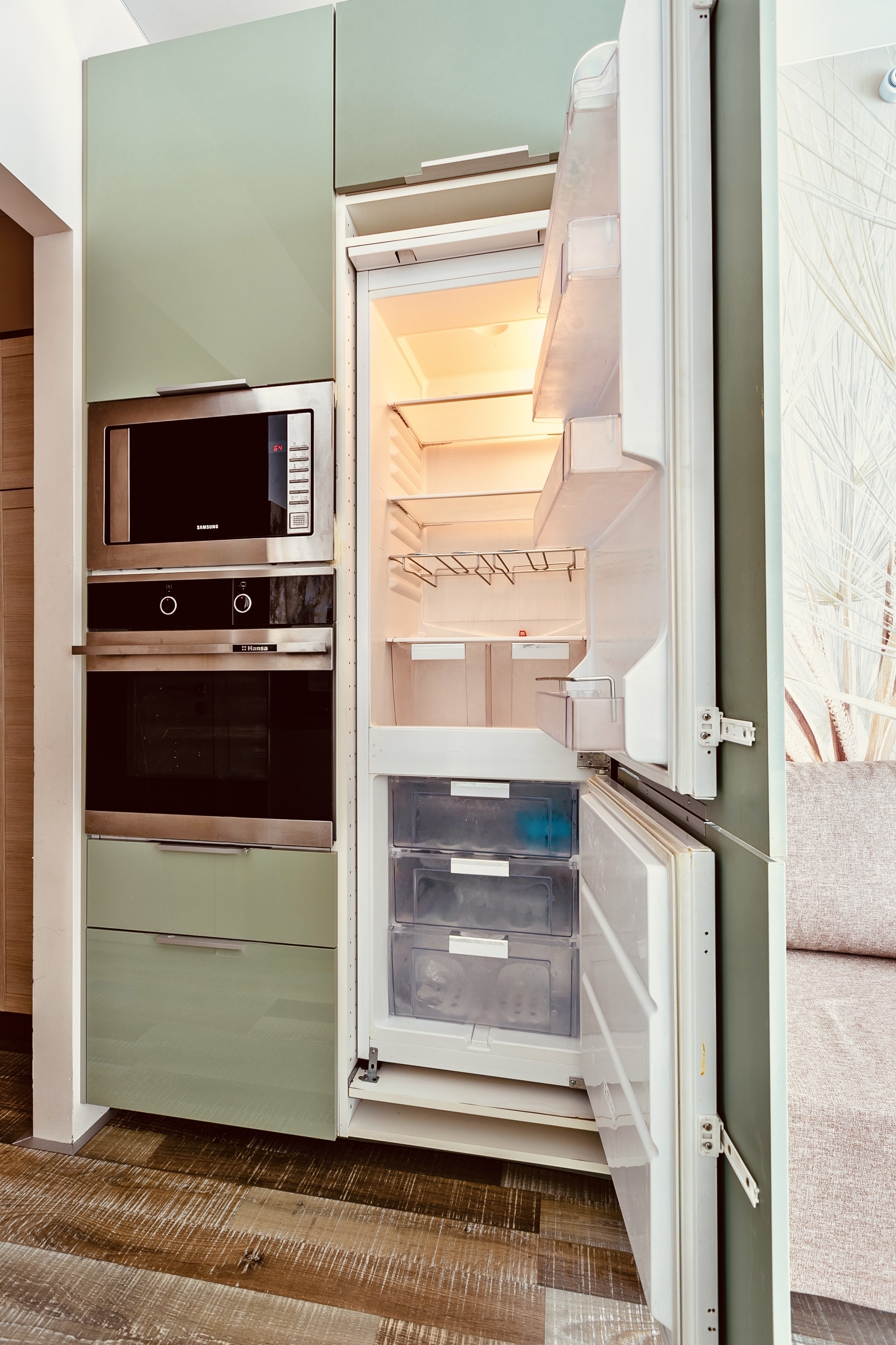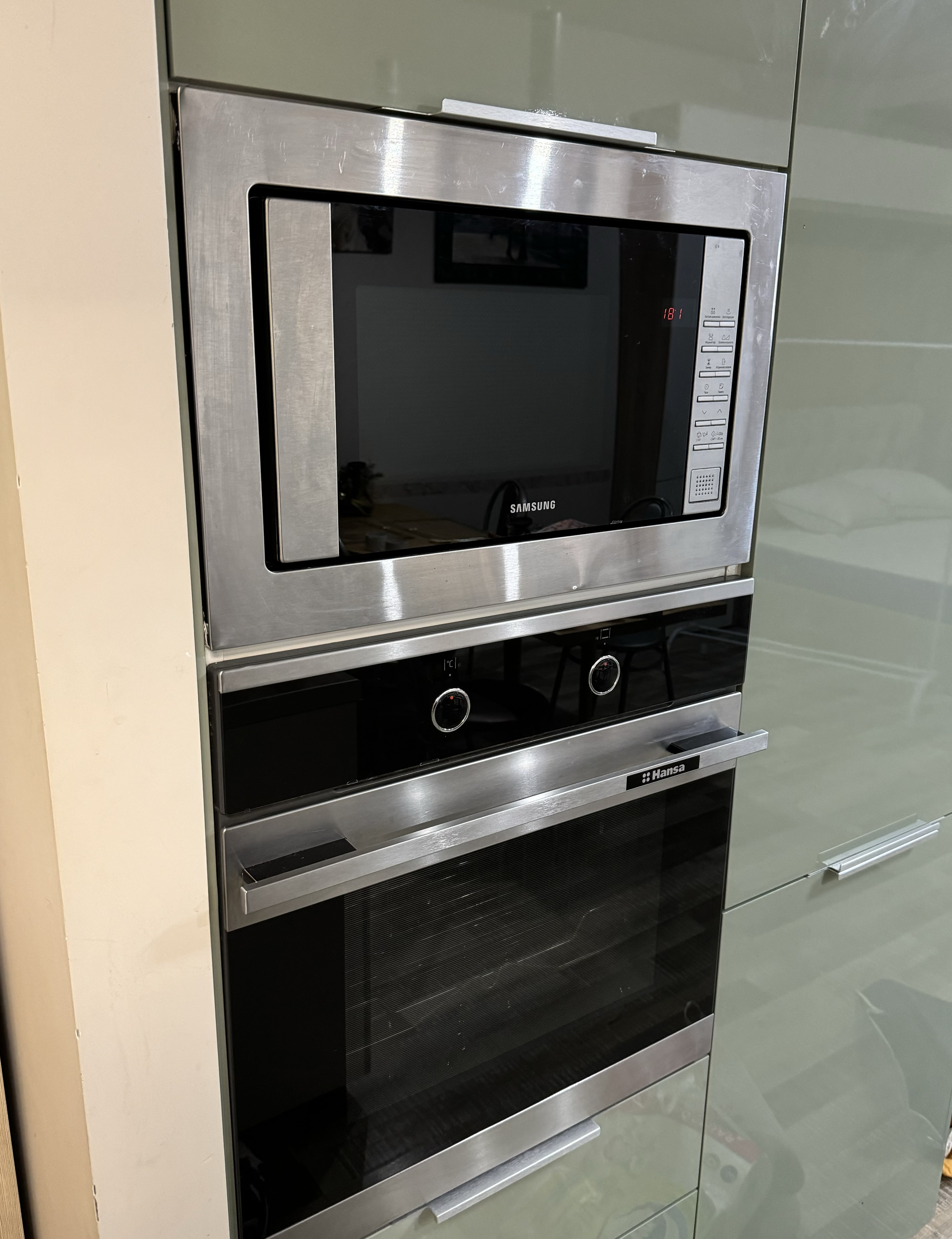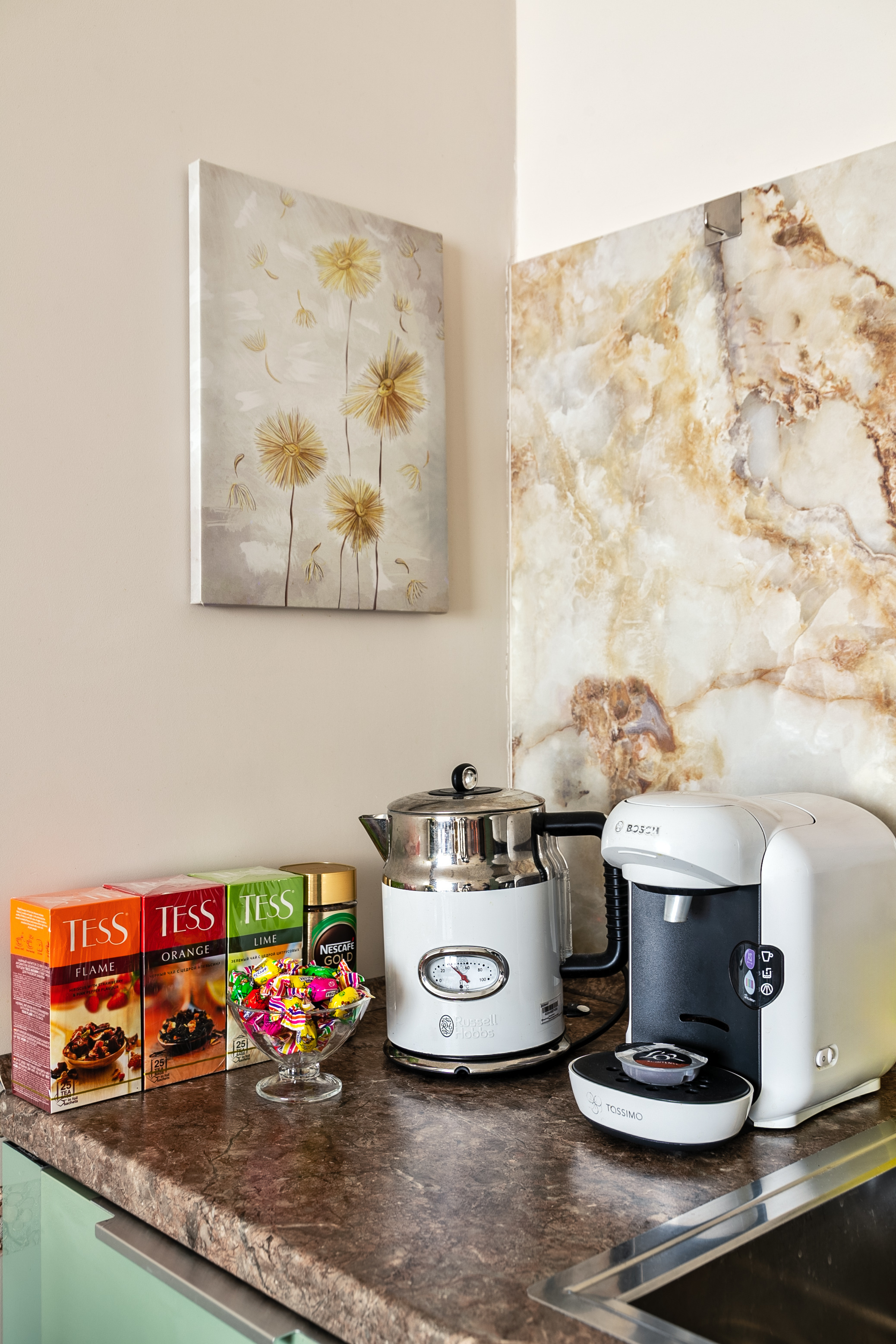 - На кухне вся техника: чайник, СВЧ, плита, духовка, холодильник.