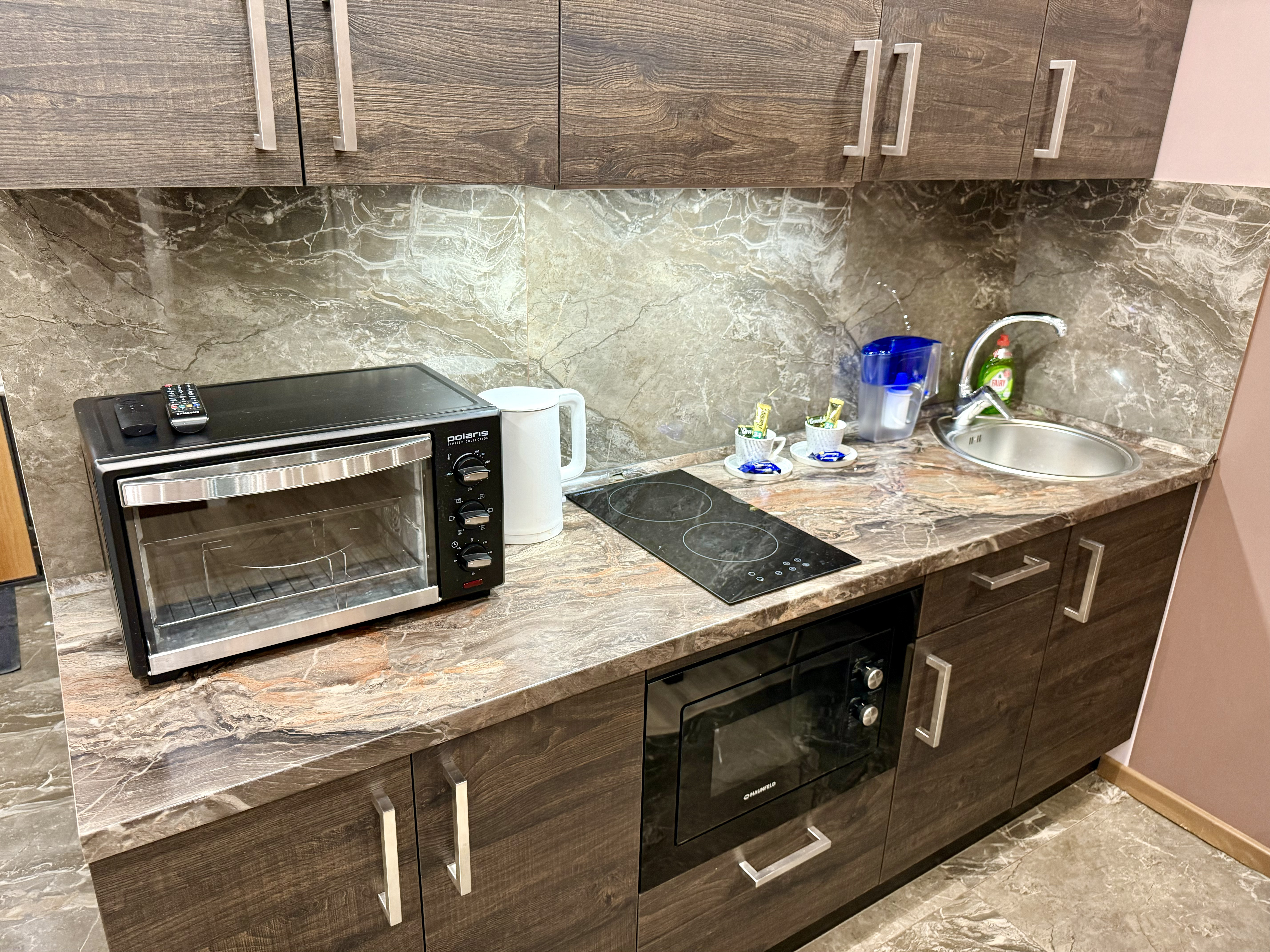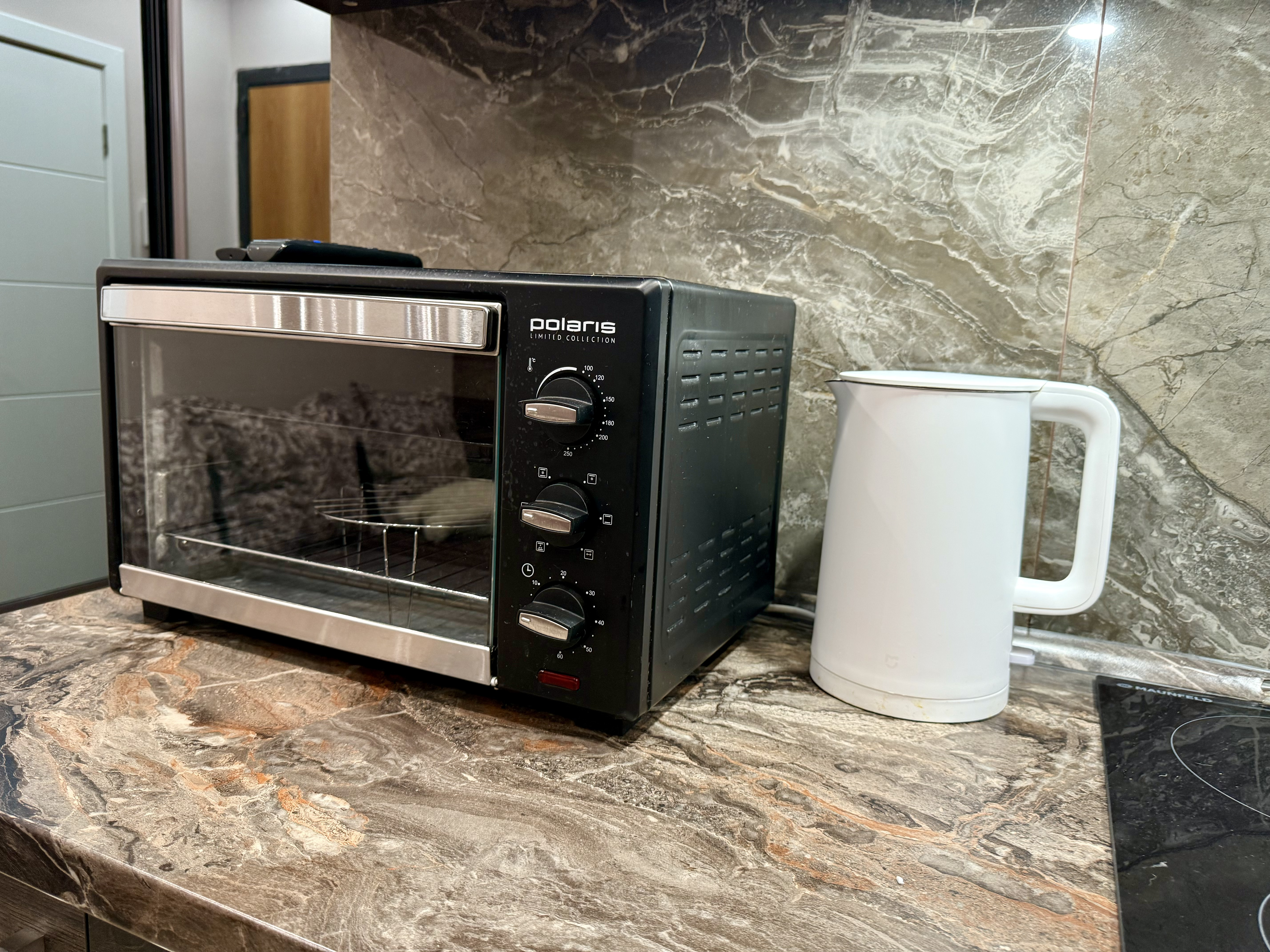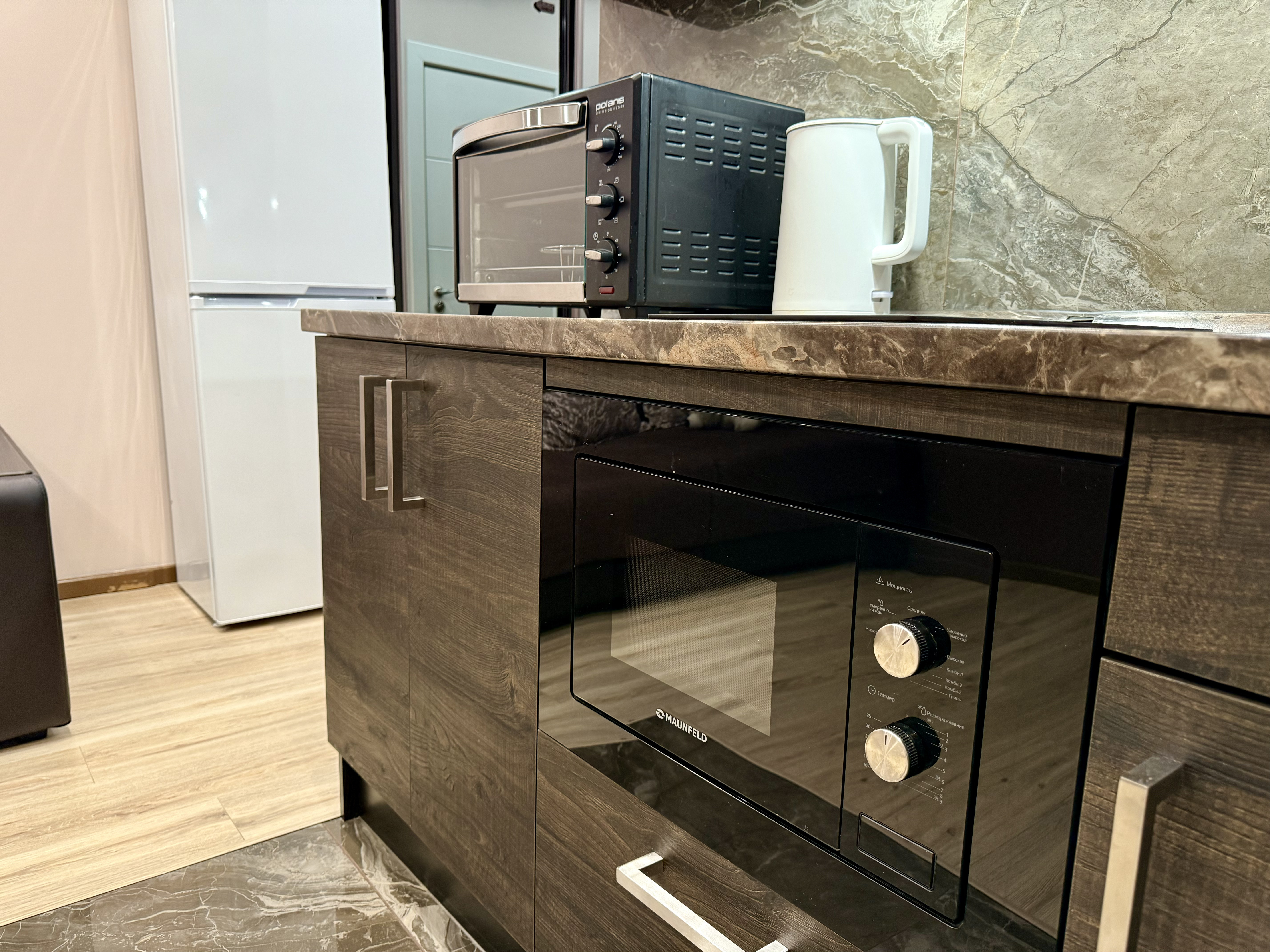 - На кухне вся техника: чайник, СВЧ, плита, духовка, холодильник.