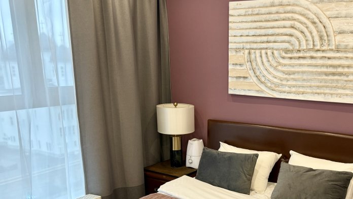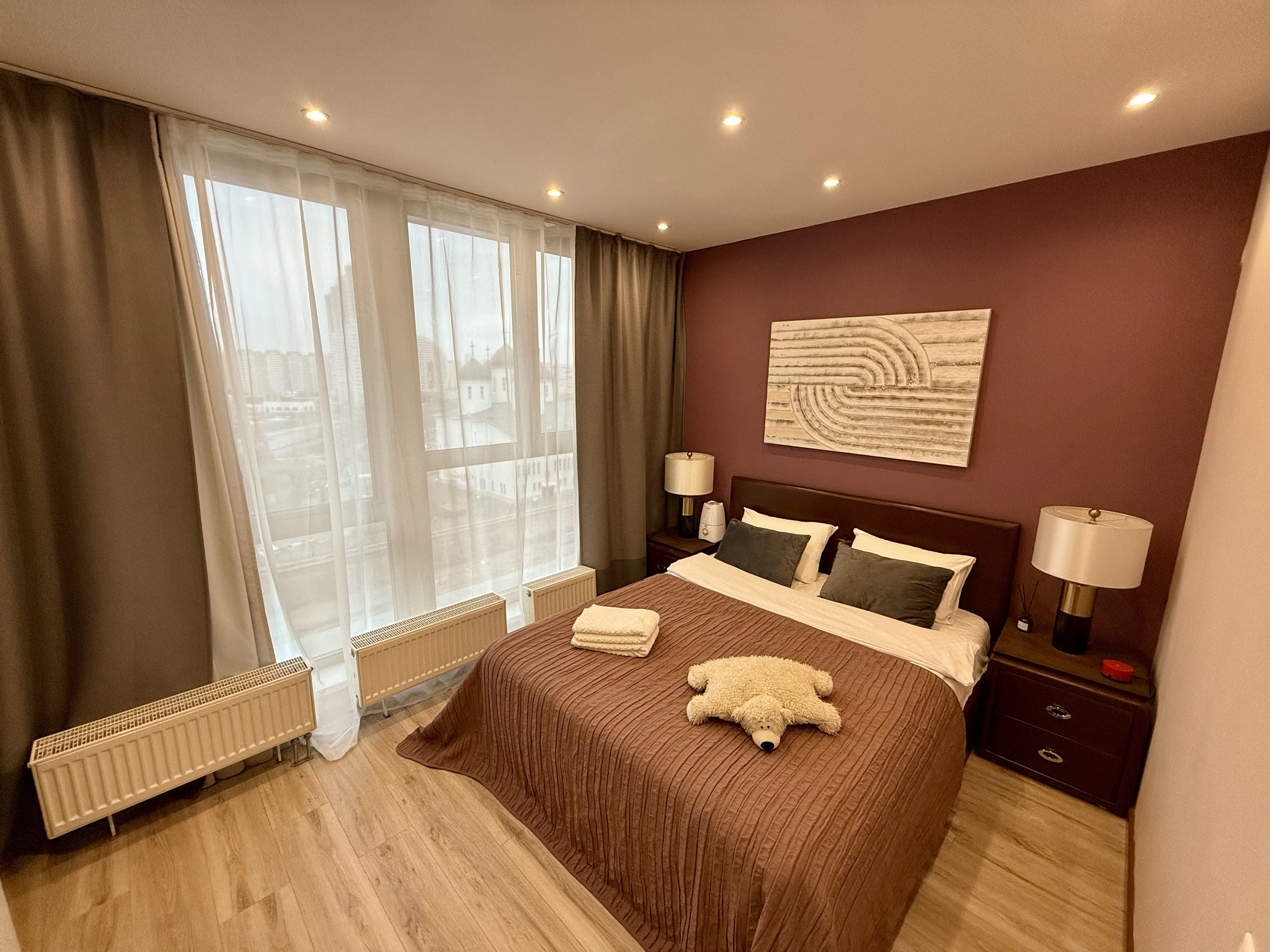 - Спальня: большая кровать 180×200 см (ортопедический матрас).