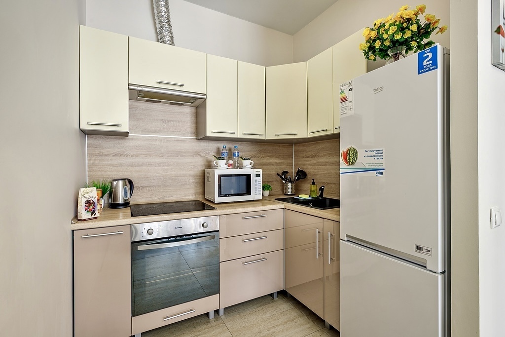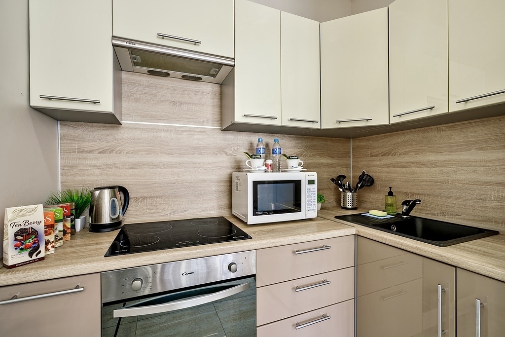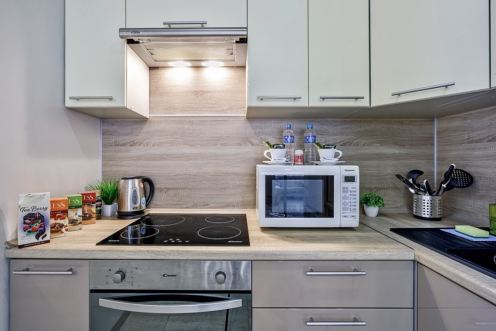- На кухне вся техника: чайник, СВЧ, плита, духовка, холодильник.