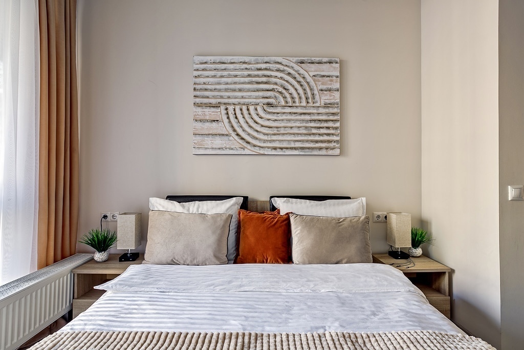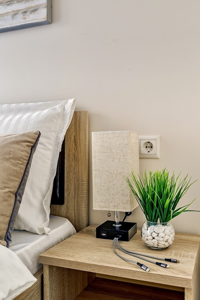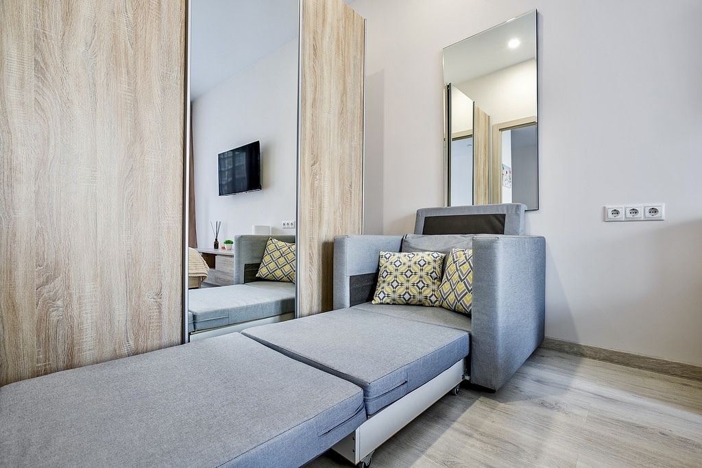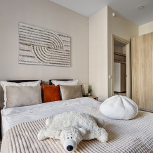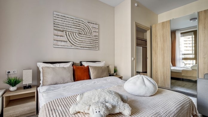 - Спальня: большая кровать 160×200 см (ортопедический матрас).
