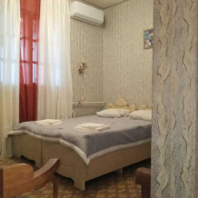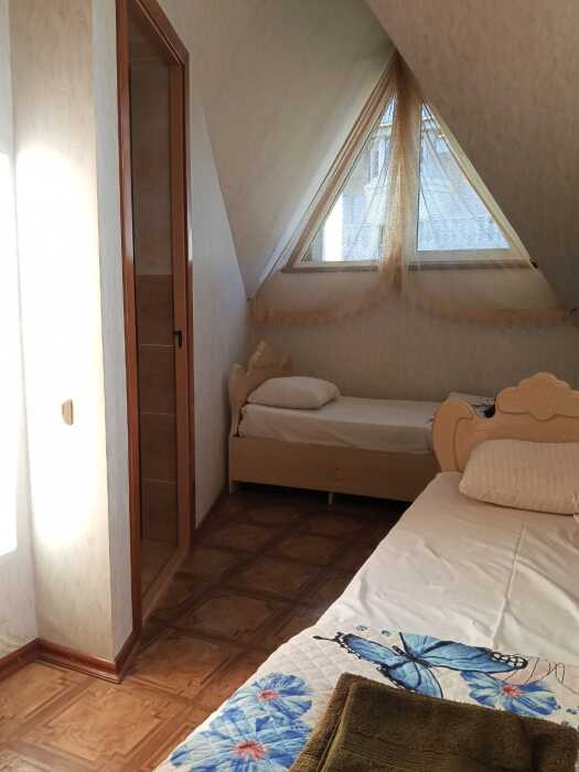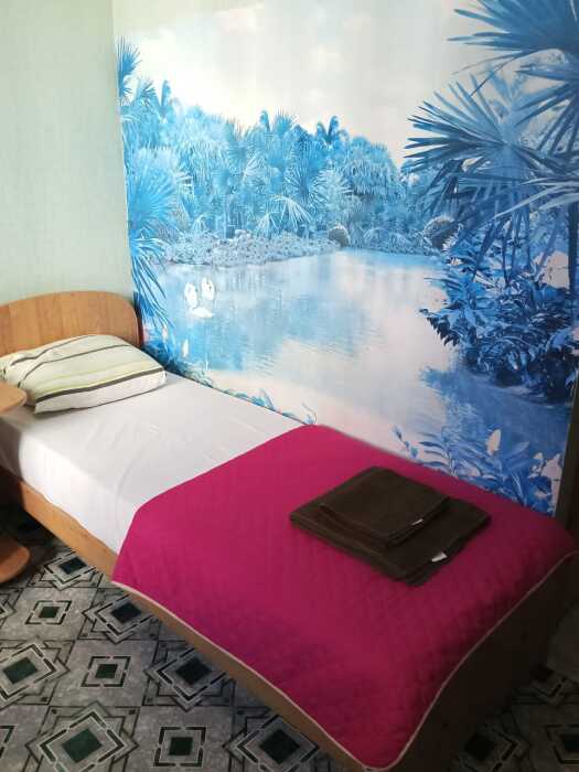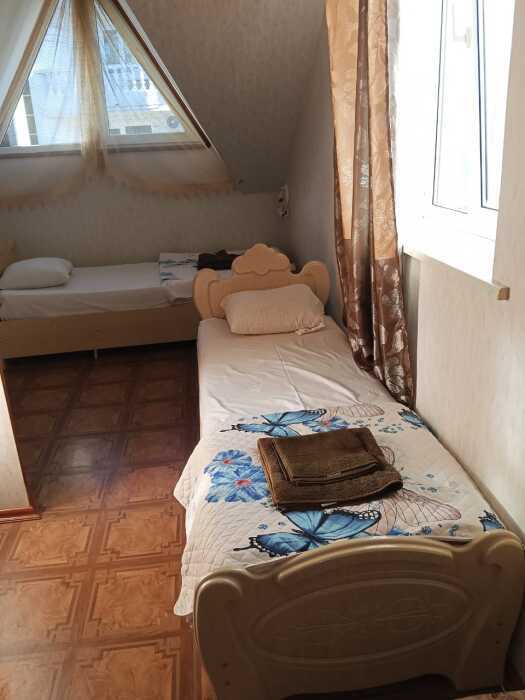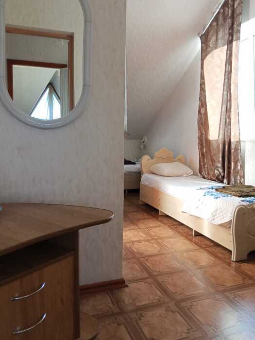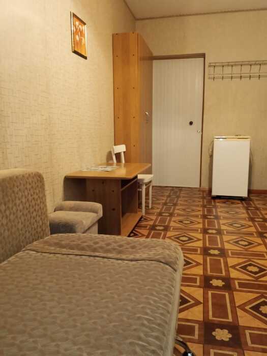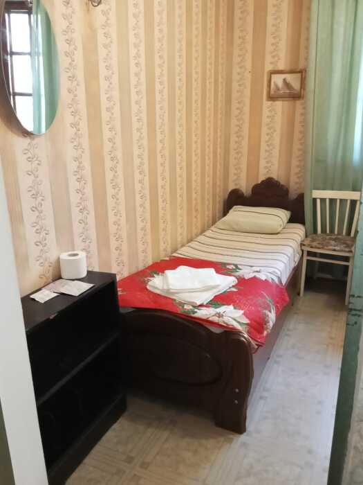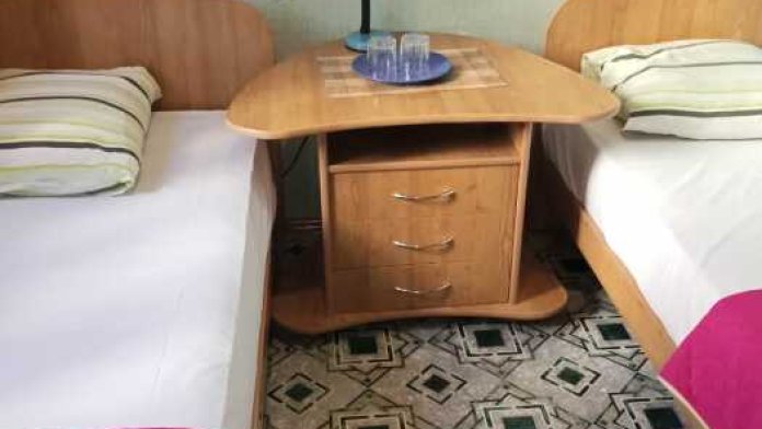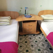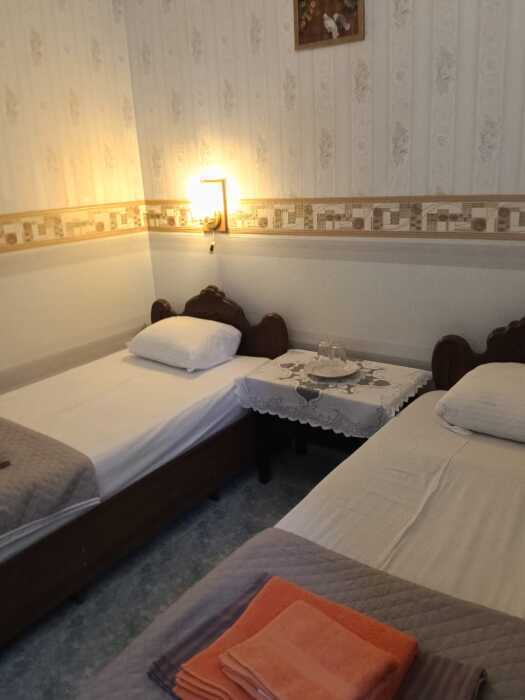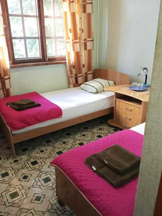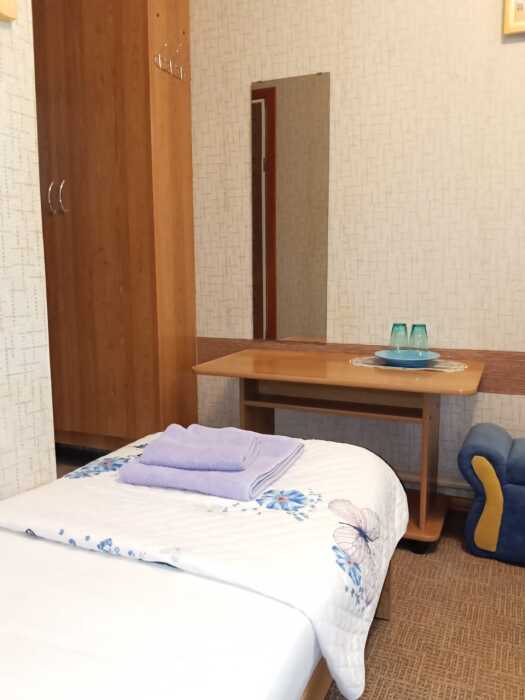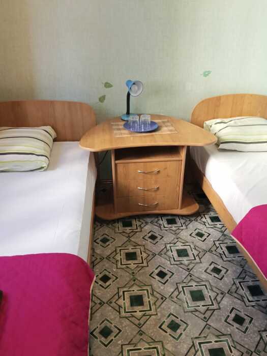 Номер оборудован: 2 кровати раздельные, стол, шифоньер, пуфики, зеркало, посуда, туалетные принадлежности.
