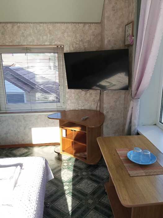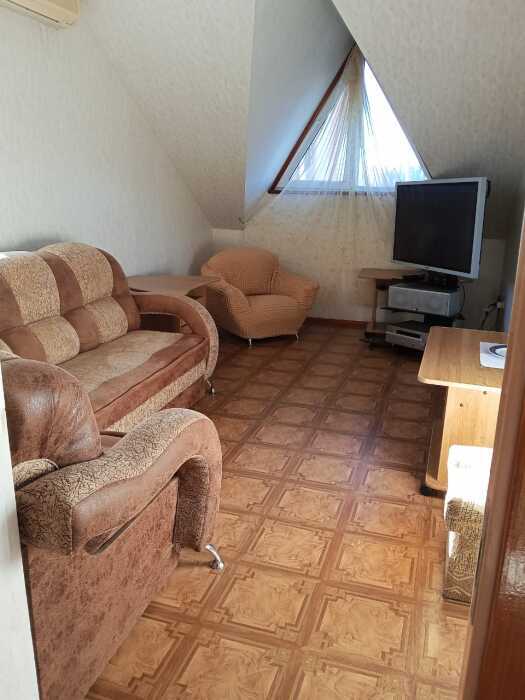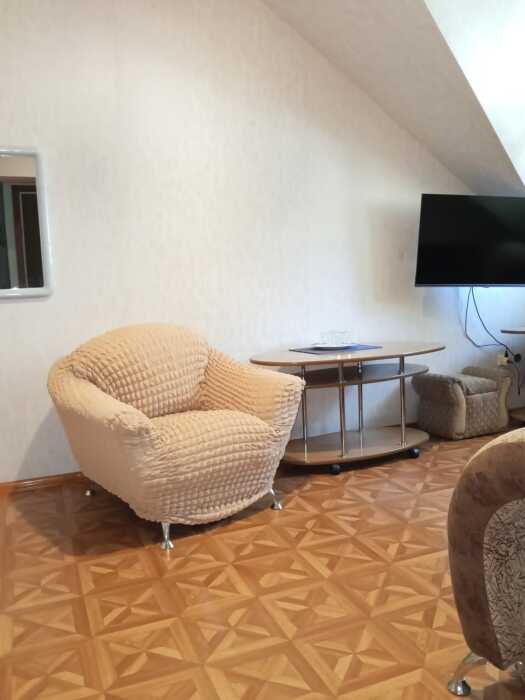 Номер оборудован: диван раскладной, 2 кровати 1,5, 2 телевизора, 2 сплит системы, 2 стола, пуфики, шифоньер, холодильник, посуда, душ, санузел, туалетные принадлежности, чайник, фен.