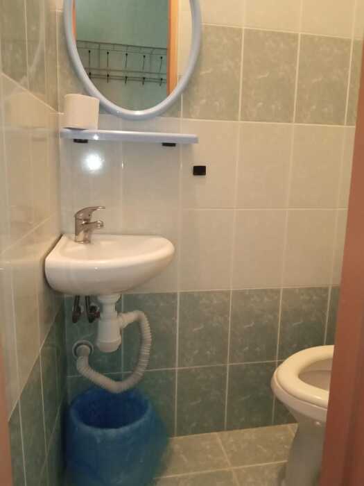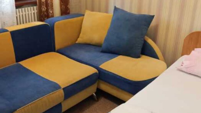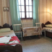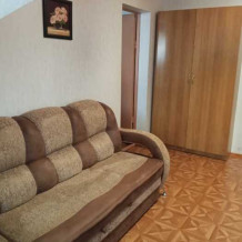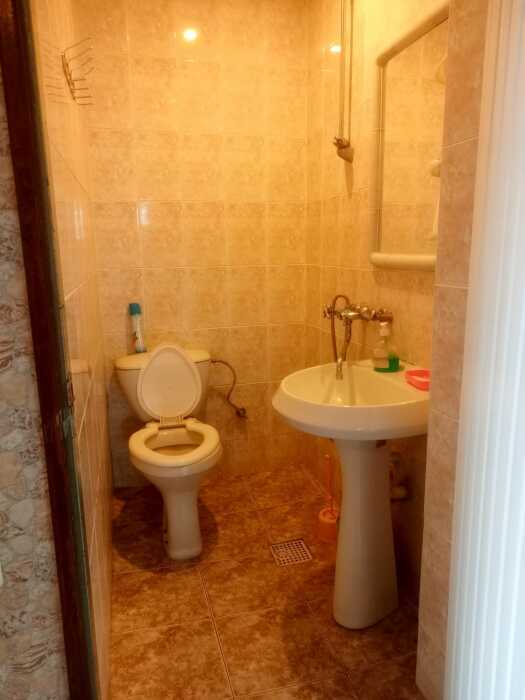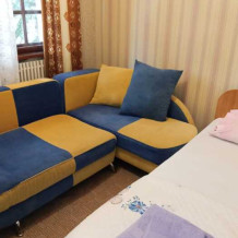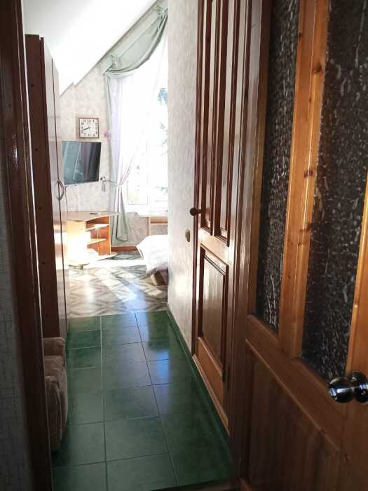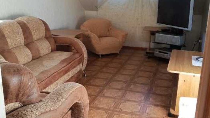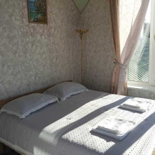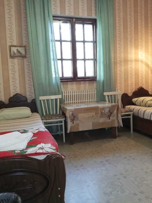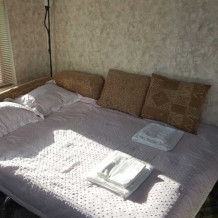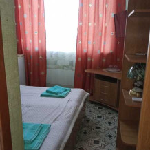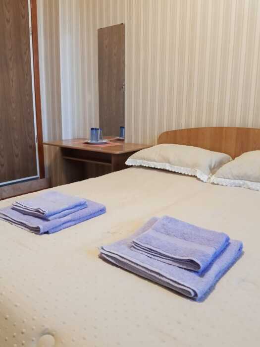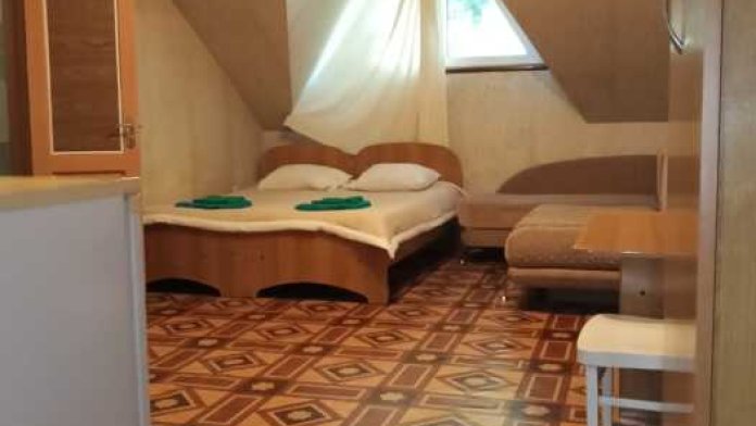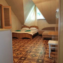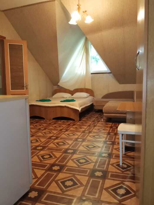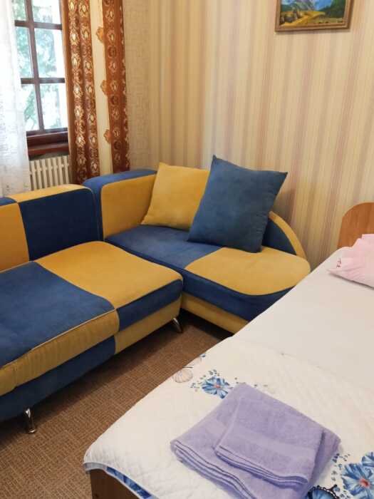 Номер оборудован всем необходимым: 2-спальная кровать, диван-кровать, 2 раскладушки, телевизор, холодильник, шифоньер, стол, посуда, пуфики, фен, чайник, санузел, туалетные принадлежности.
