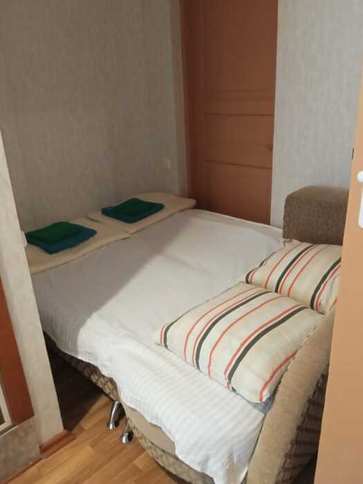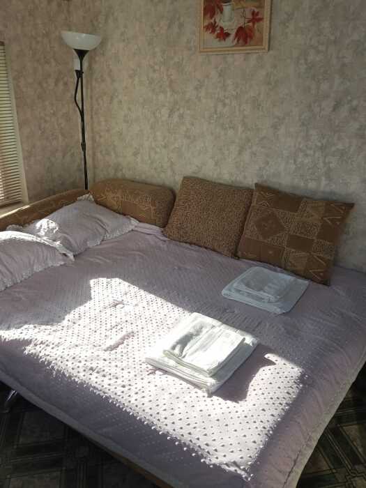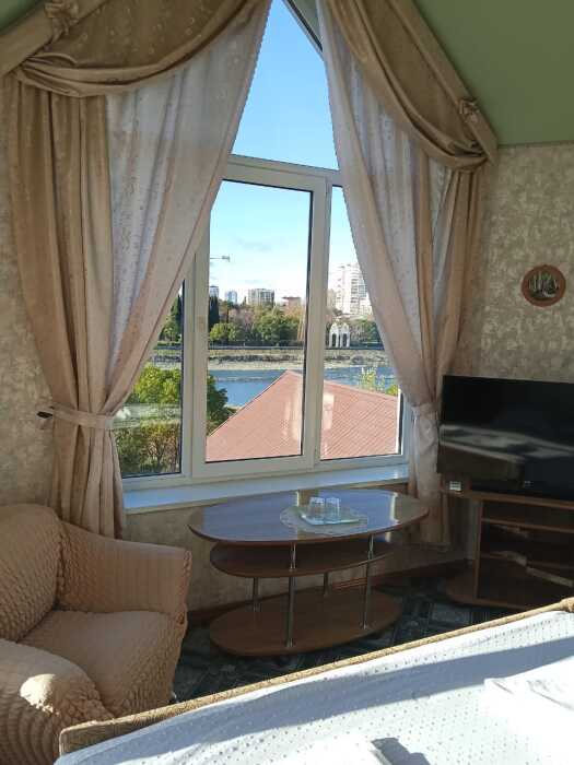 Номер оборудован: кровать, диван-кровать, холодильник, телевизор, сплит-система, посуда, стол, пуфики, душевая, санузел, туалетные принадлежности.