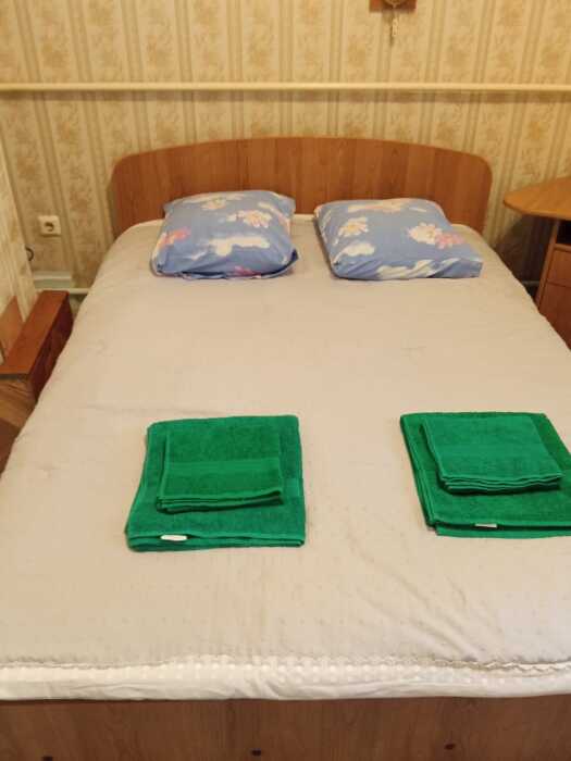 Номер оборудован: 2-спальная кровать, телевизор, сплит-система, холодильник, стол, пуфики, посуда, шифоньер, санузел, туалетные принадлежности.