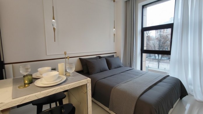 Центральные апартаменты с панорамным видом в новом жилом в центре Жуковского. Современная студия с панорамными окнами в новом жилом комплексе на улице Гагарина в центре Жуковского. Идеальный выбор для командированных специалистов, туристов и участников авиационных мероприятий. Включено: парковка на территории и хороший Wi-Fi.