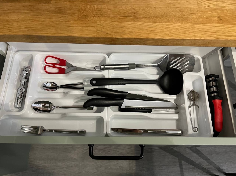 Уютная кухня укомплектована всей необходимой посудой и бытовой техникой.