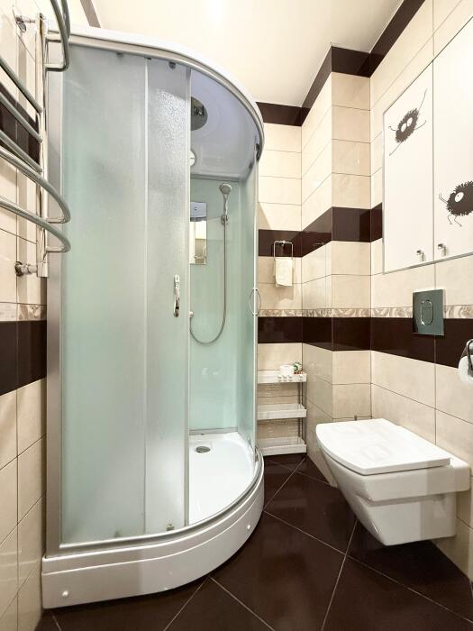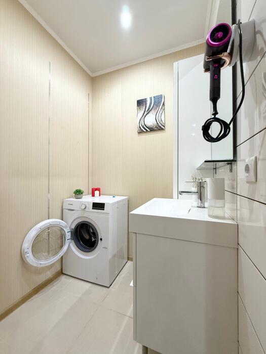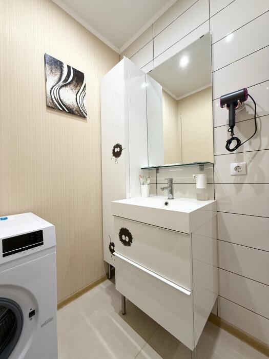 Кухня оснащена всеми необходимыми бытовыми приборами (посудомоечная машина, холодильник, микроволновка, электрический чайник) и столовыми принадлежностями (кастрюли, сковорода, кружки, тарелки, столовые приборы). Цифровое телевидение, высокоскоростной безлимитный интернет (wi-fi). Раздельный санузел. Ванная и туалет – плитка.
