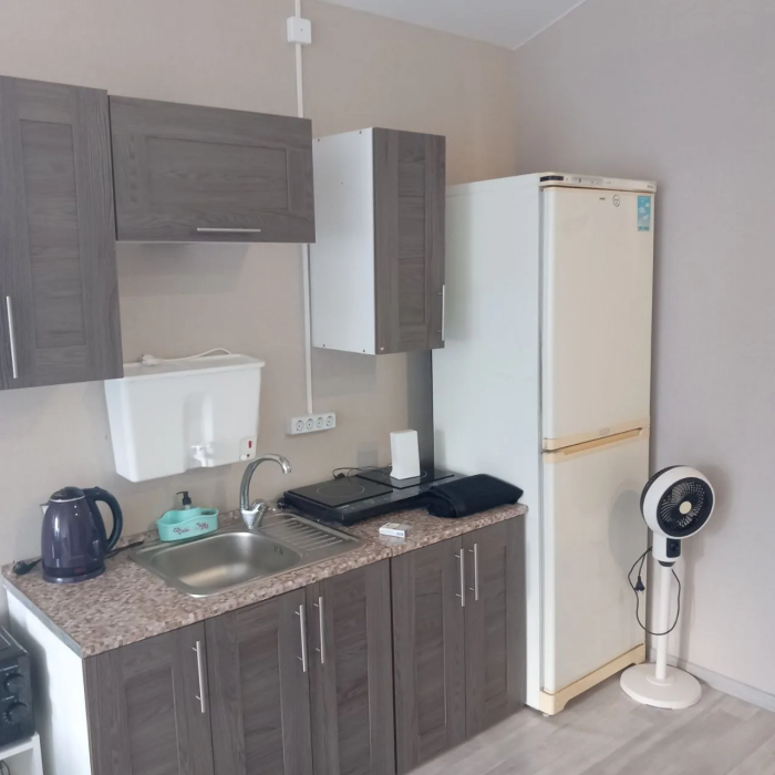 Бытовая техника: холодильник, индукциoнная плитa, микроволновка, телевизор, кулер, фен.