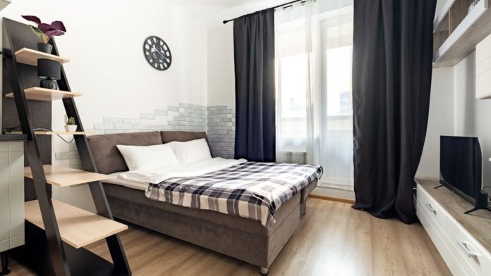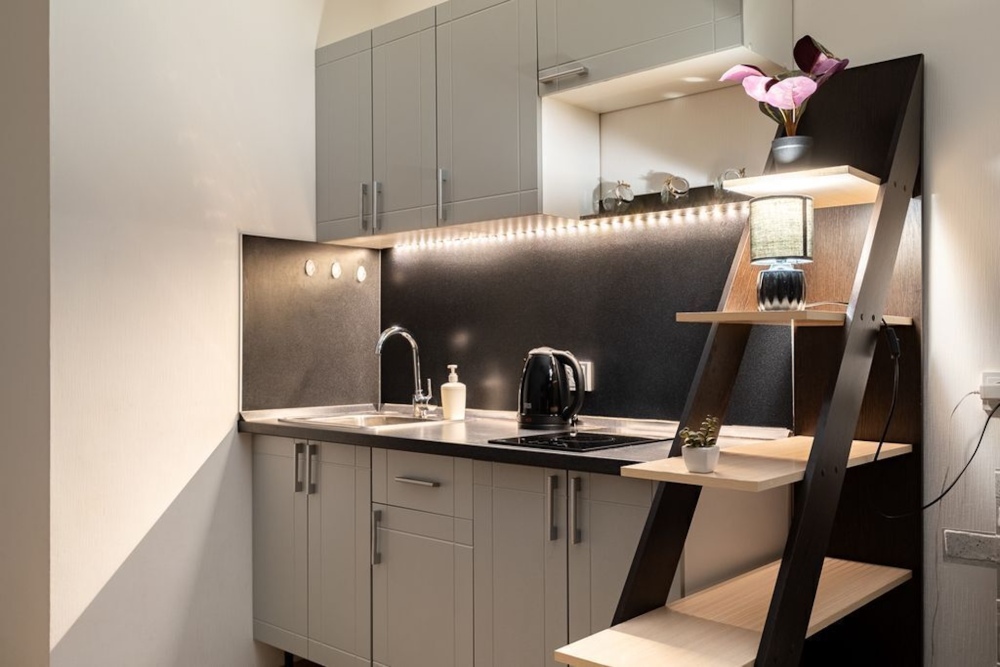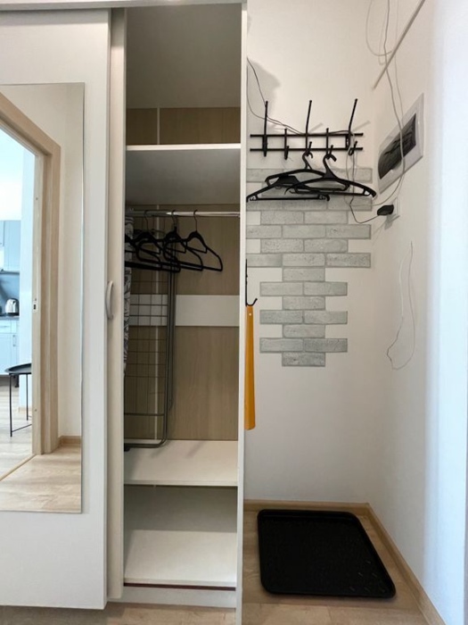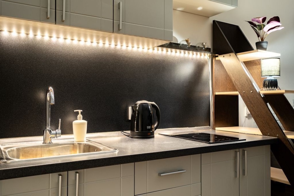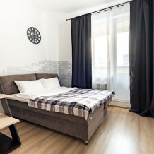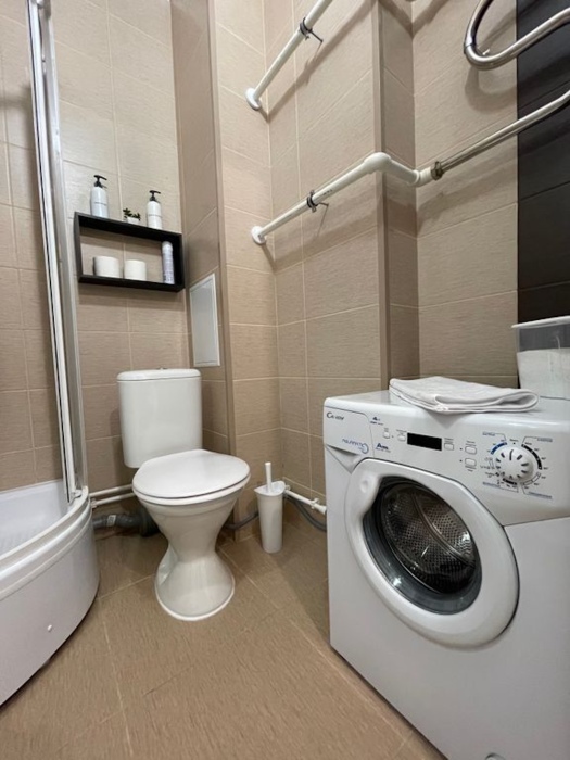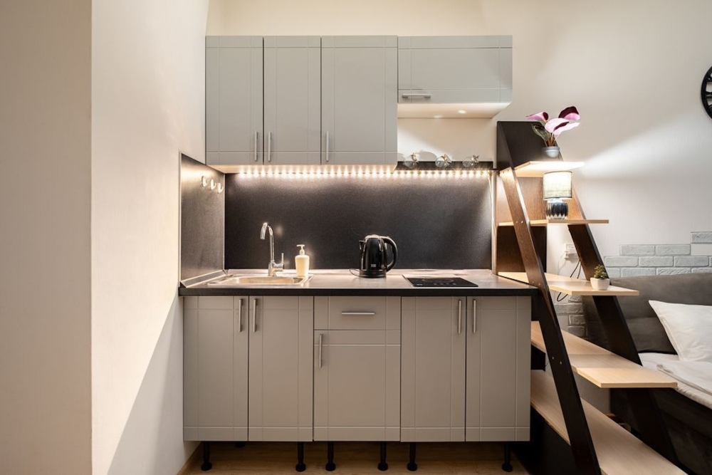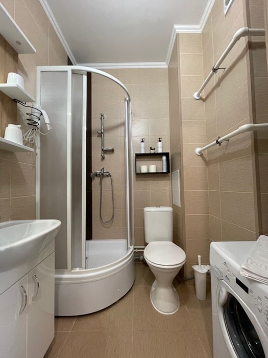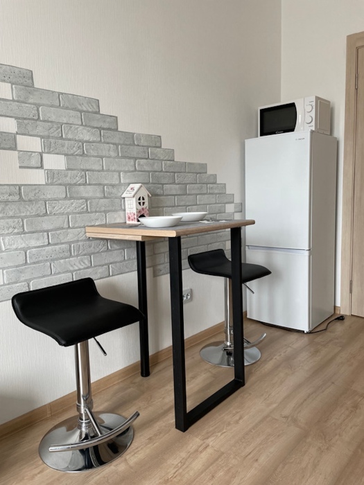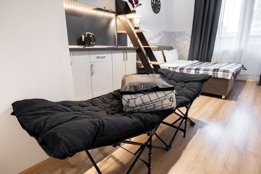 Уютная студия, где есть все необходимое для проживания на 3 гостей. Имеется диван с матрасом и современная удобная раскладушка для 3-го гостя. Наличие постельного белья, комплектов полотенец, а также всех необходимых кухонных принадлежностей.